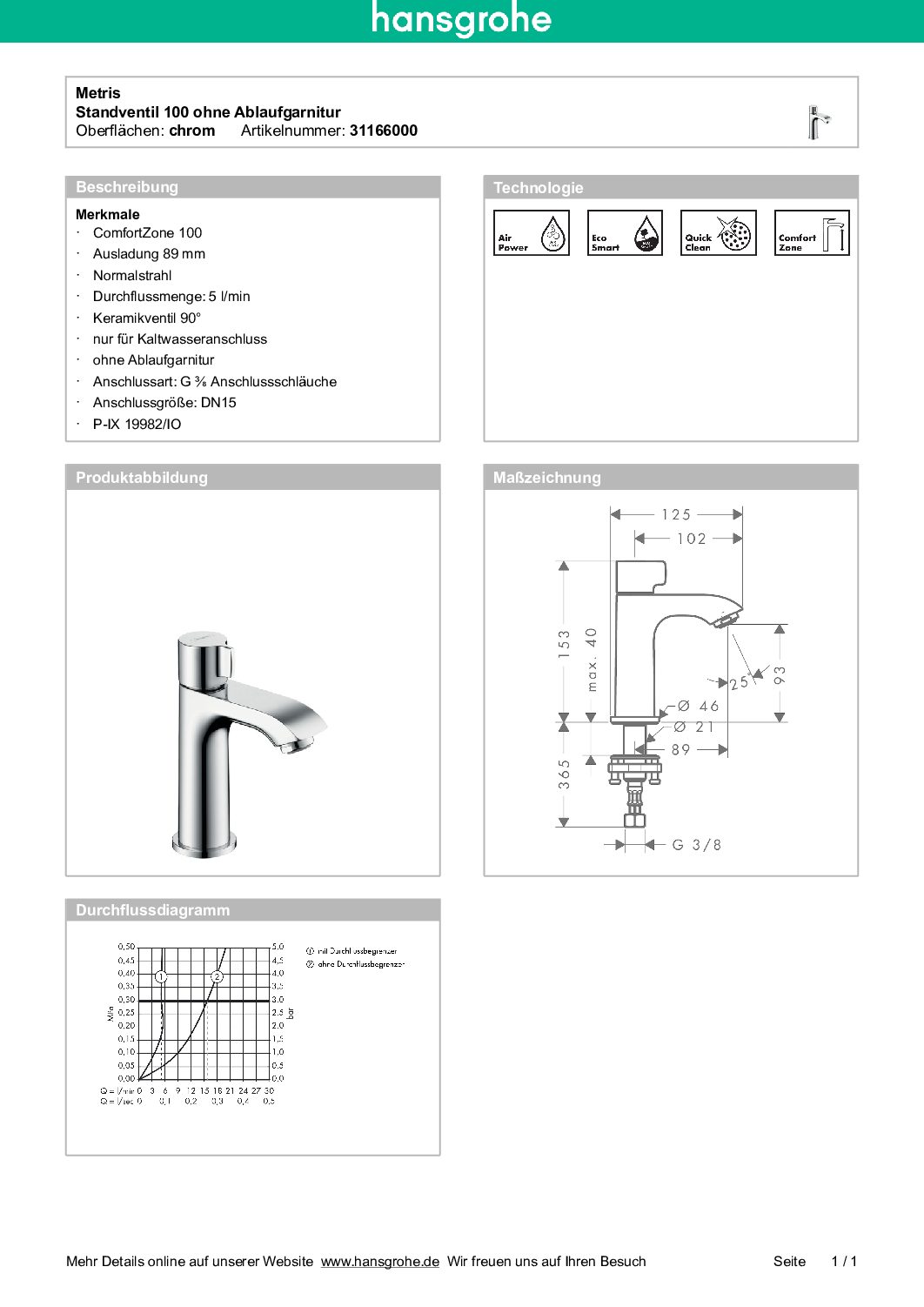 Standventil Hansgrohe 100 Metris Ausladung 89 mm chrom