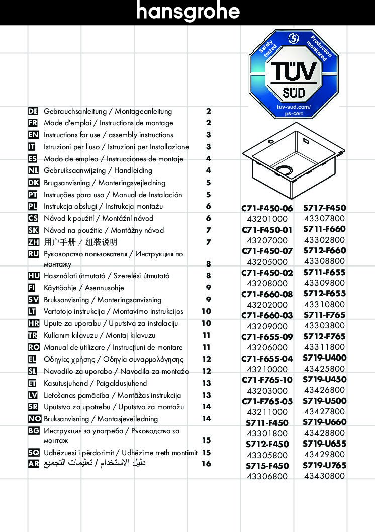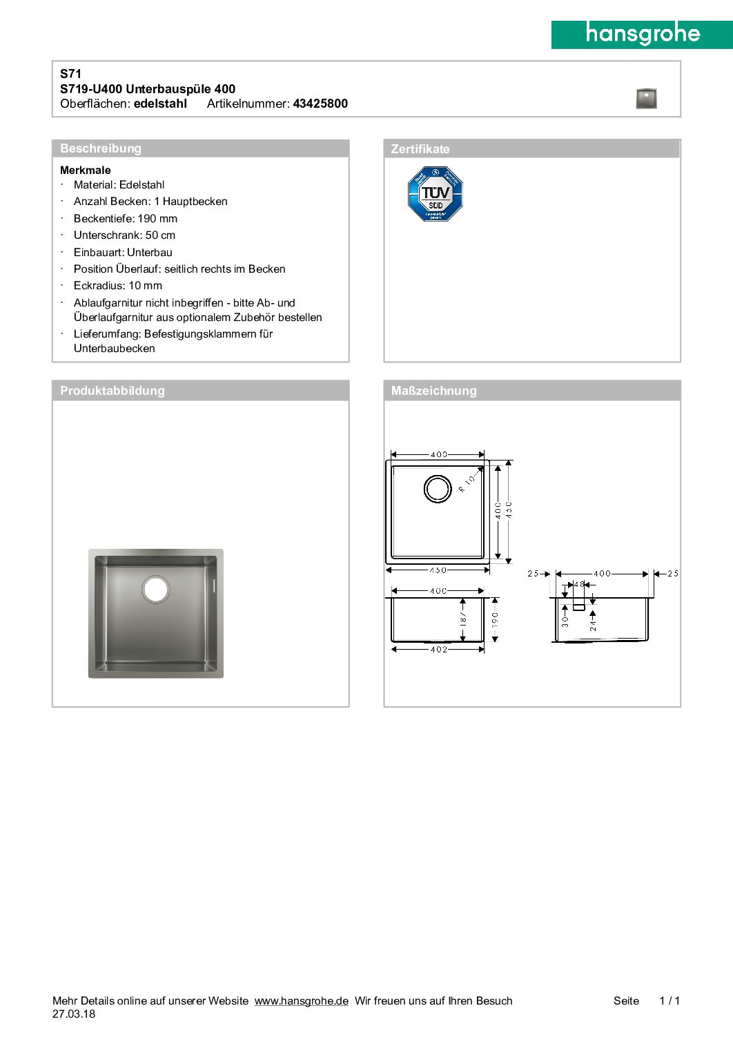 Unterbauspüle Hansgrohe 500 S719-U400 Becken BxT: 400×400 mm