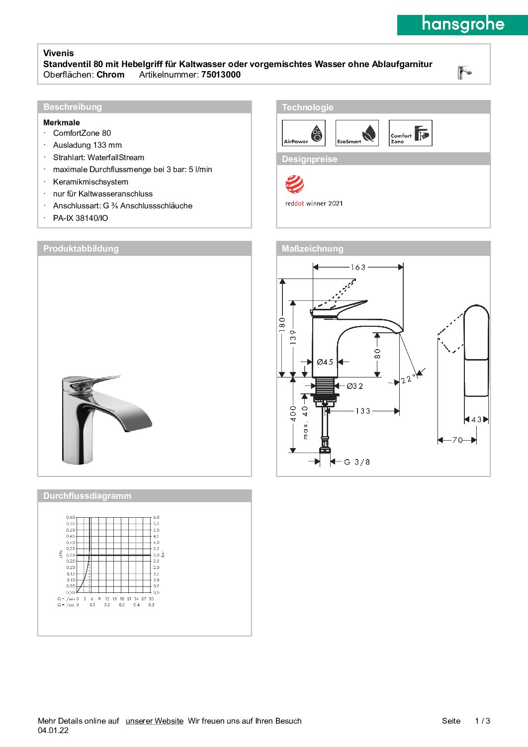 Standventil Hansgrohe 80 Vivenis Ausladung 133 mm chrom