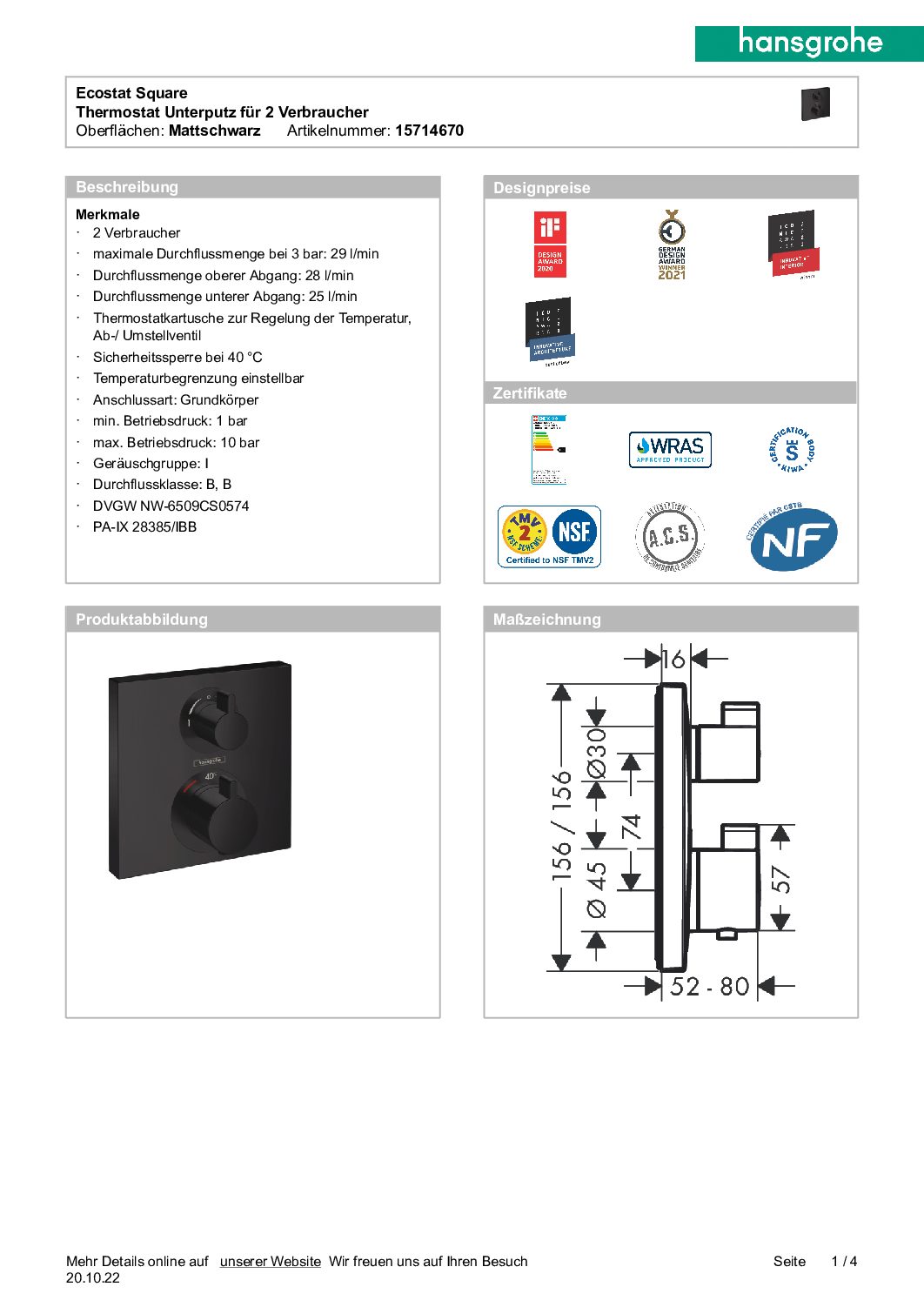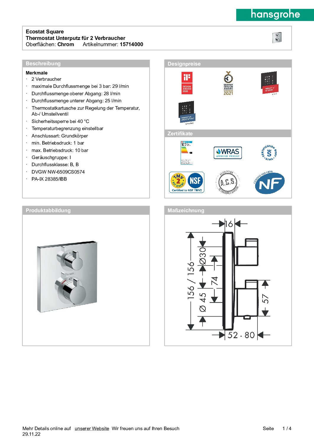 Unterputz Ecostat Square Hansgrohe , 1 Verbraucher chrom