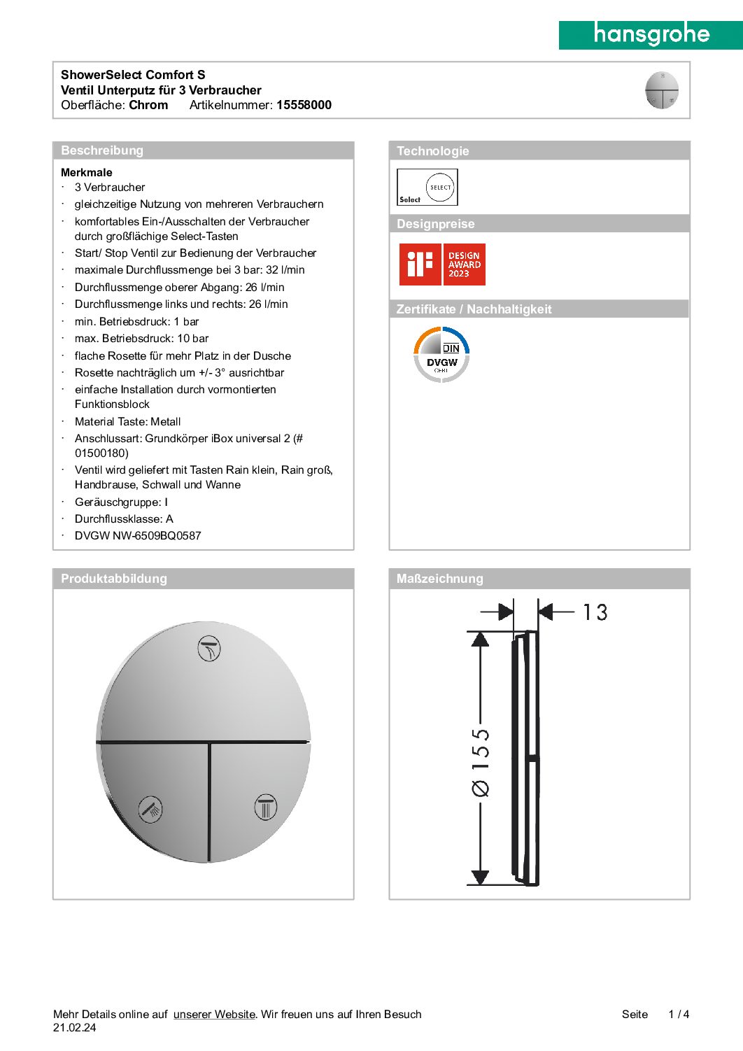 Unterputz-Absperrventil Hansgrohe ShowerSelect Comfort S Fertigset 3 Verbraucher chrom