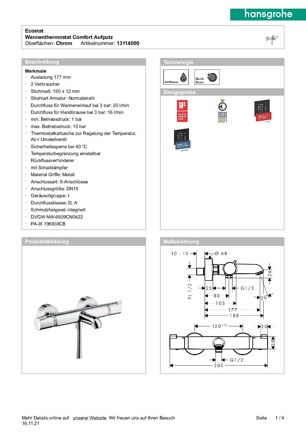 AP-Wannenthermostat Hansgrohe Ecostat 1001 CL Ausladung 182 mm chrom