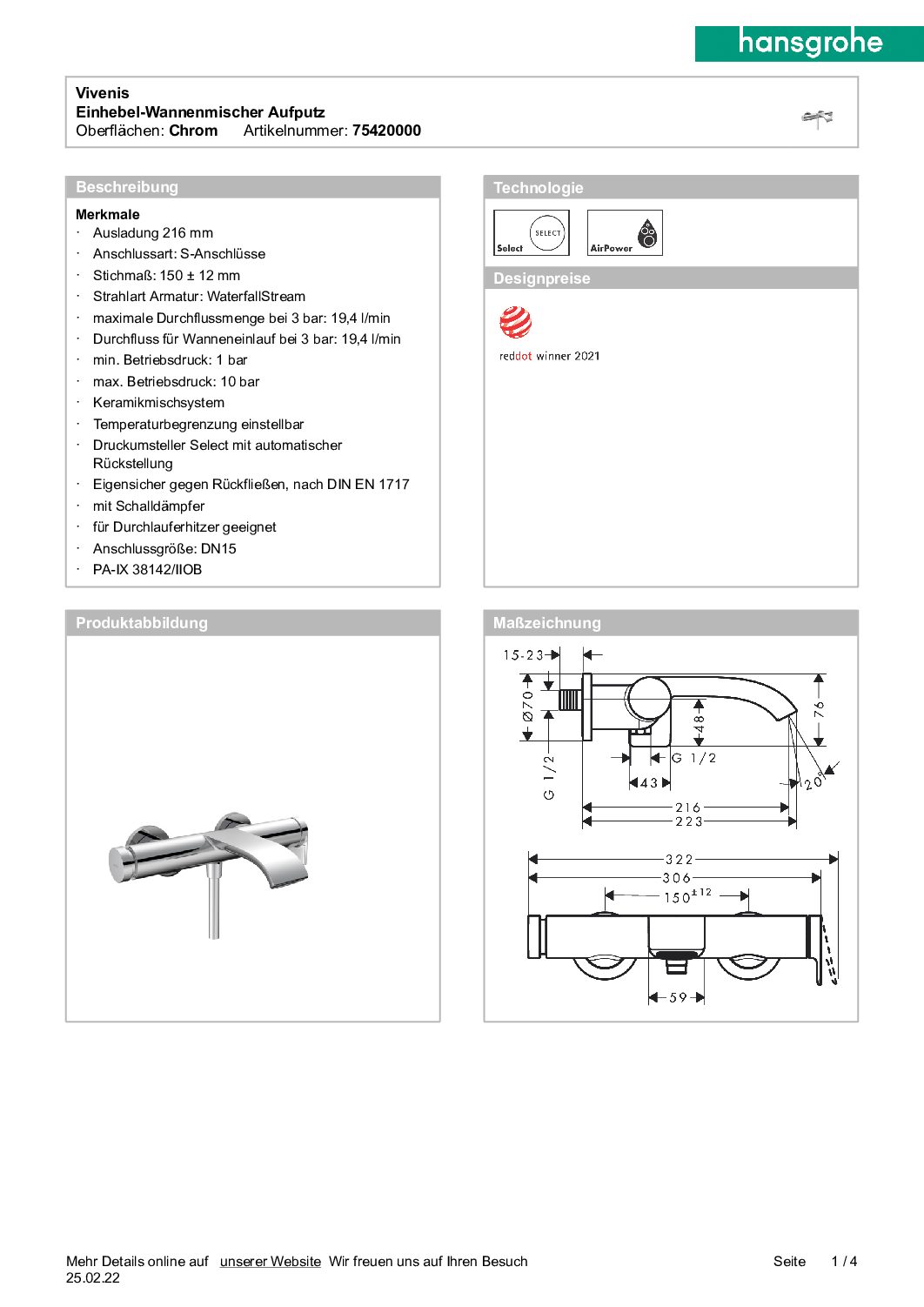 AP-Wannenmischer Hansgrohe Vivenis Ausladung 223 mm chrom