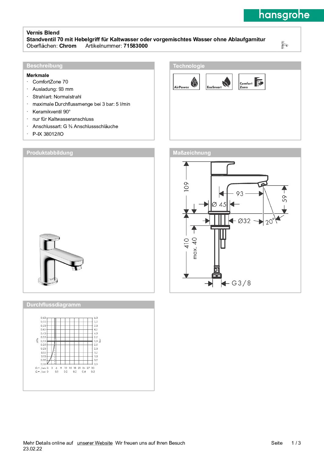 Standventil Hansgrohe 70 Vernis Blend Ausladung 93 mm chrom