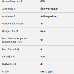 Panzerschläuche KTW-A mit Edelstahlumflechtung L=800mm 3/8" IGÜxAG