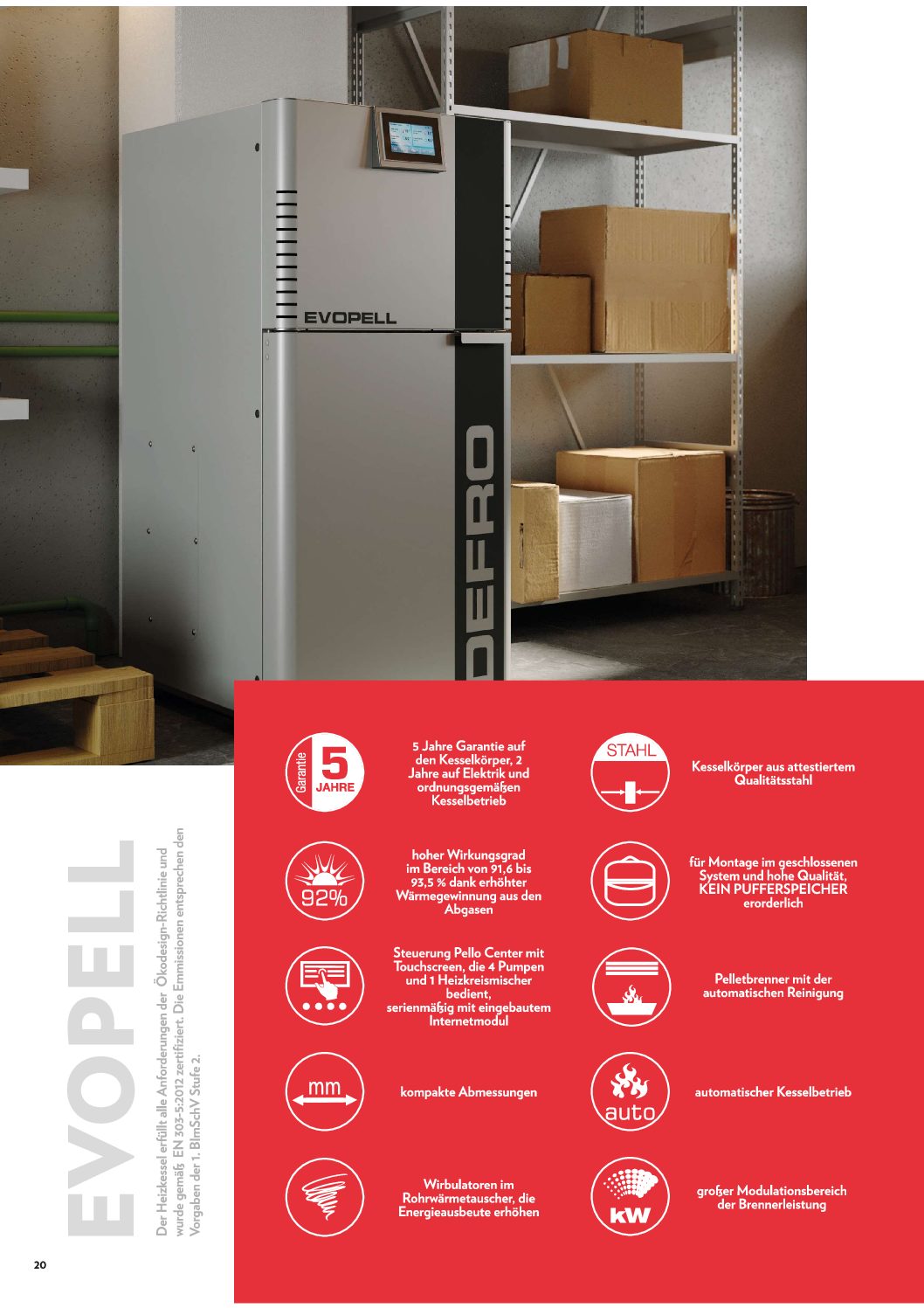 Die Heizkessel EVOPELL sind als Wärmeerzeuger für Warmwasserheizungsanlagen mit einer Vorlauftemperatur von 80°C geeignet und zugelassen. Der Einbau in offene Heizungsanlagen nach DIN 12828 und in geschlossene Heizungsanlagen nach DIN 12828 ist möglich.
