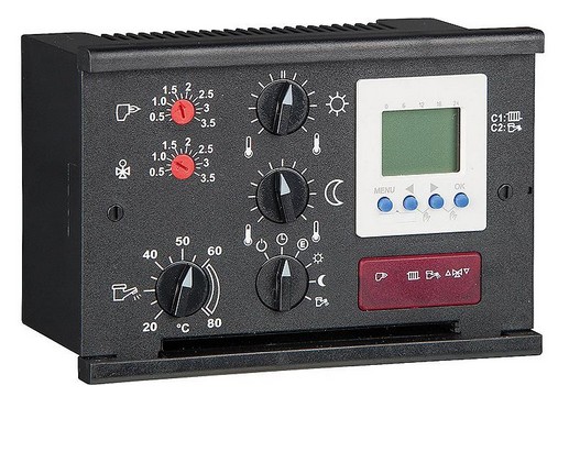 • Elektronische Speichertemperaturregelung, Speichervorrangschaltung, Ladepumpennachlauf, Betriebswahlschalter, Kesselanfahrschutz