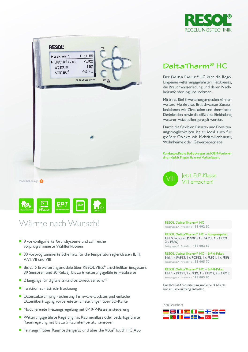 • Bis zu 5 Erweiterungsmodule über Resol VBus® anschließbar (insgesamt 39 Sensoren und 30 Relais), bis zu 6 witterungsgeführte Heizkreise
