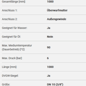 Panzerschläuche KTW-A mit Edelstahlumflechtung L=1000mm 3/8″ IGÜxAG