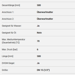 Panzerschläuche KTW-A mit Edelstahlumflechtung L=500mm 1/2″ IGÜxIGÜ