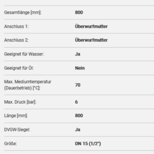Panzerschläuche KTW-A mit Edelstahlumflechtung L=800mm 1/2″ IGÜxIGÜ