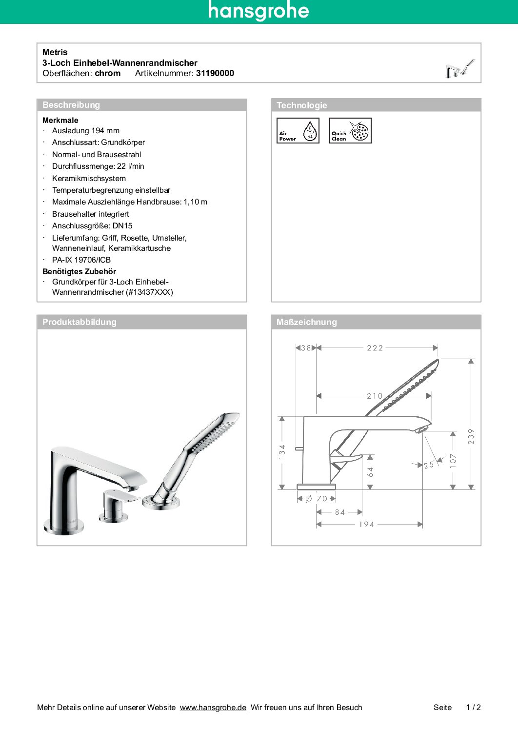 3-Loch Wannenrandmischer Hansgrohe Metris Ausladung 194 mm chrom