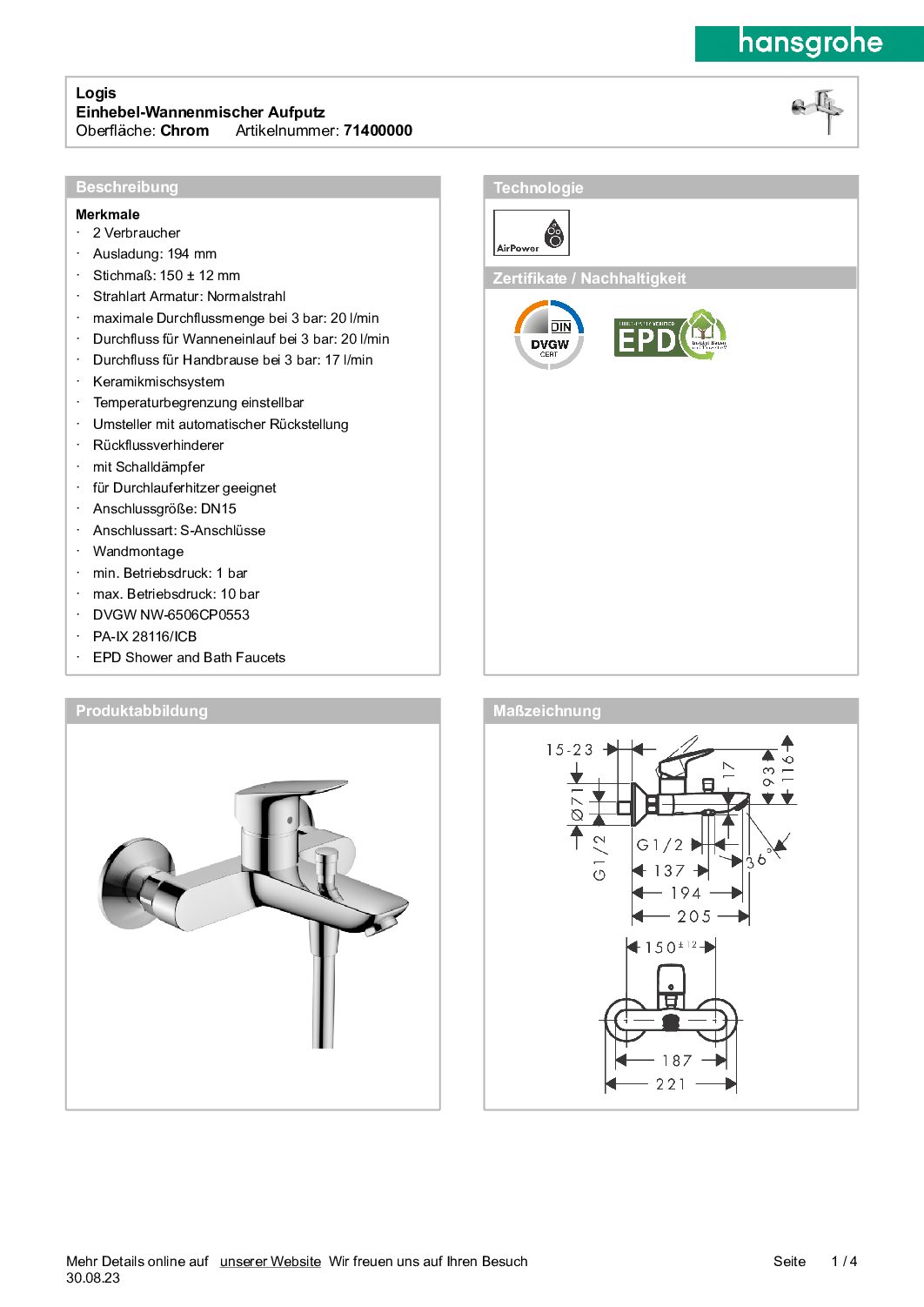 AP-Wannenmischer Hansgrohe Logis Ausladung 194 mm chrom