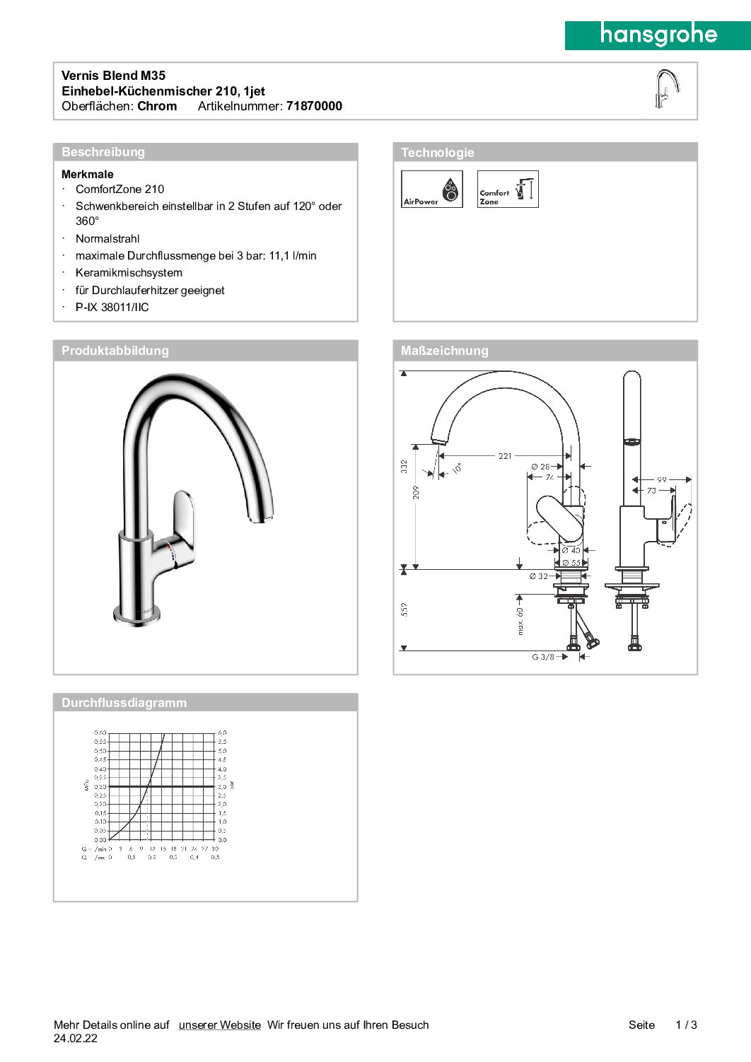 Spültischmischer Hansgrohe 210 Vernis Blend M35 Schwenkauslauf Ausladung 221 mm chrom