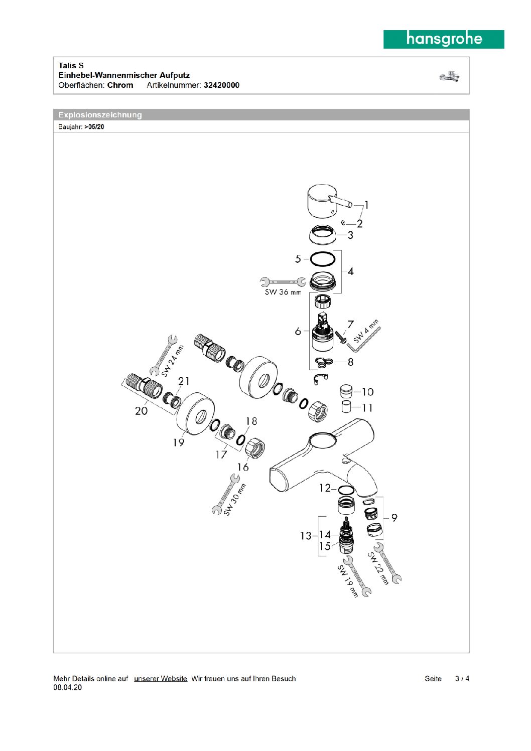 AP-Wannenmischer Hansgrohe Talis S Ausladung 172,5 – 180 mm chrom