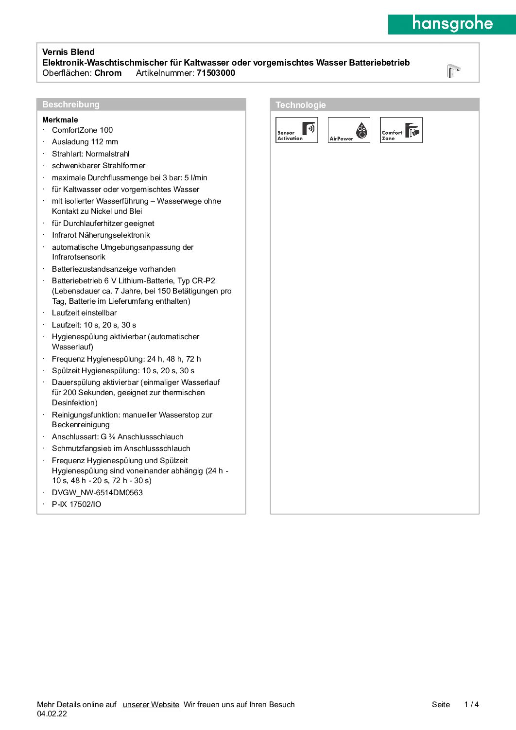 Sensor-Armatur Hansgrohe Vernis Blend Batterieversion für Kaltwasser chrom