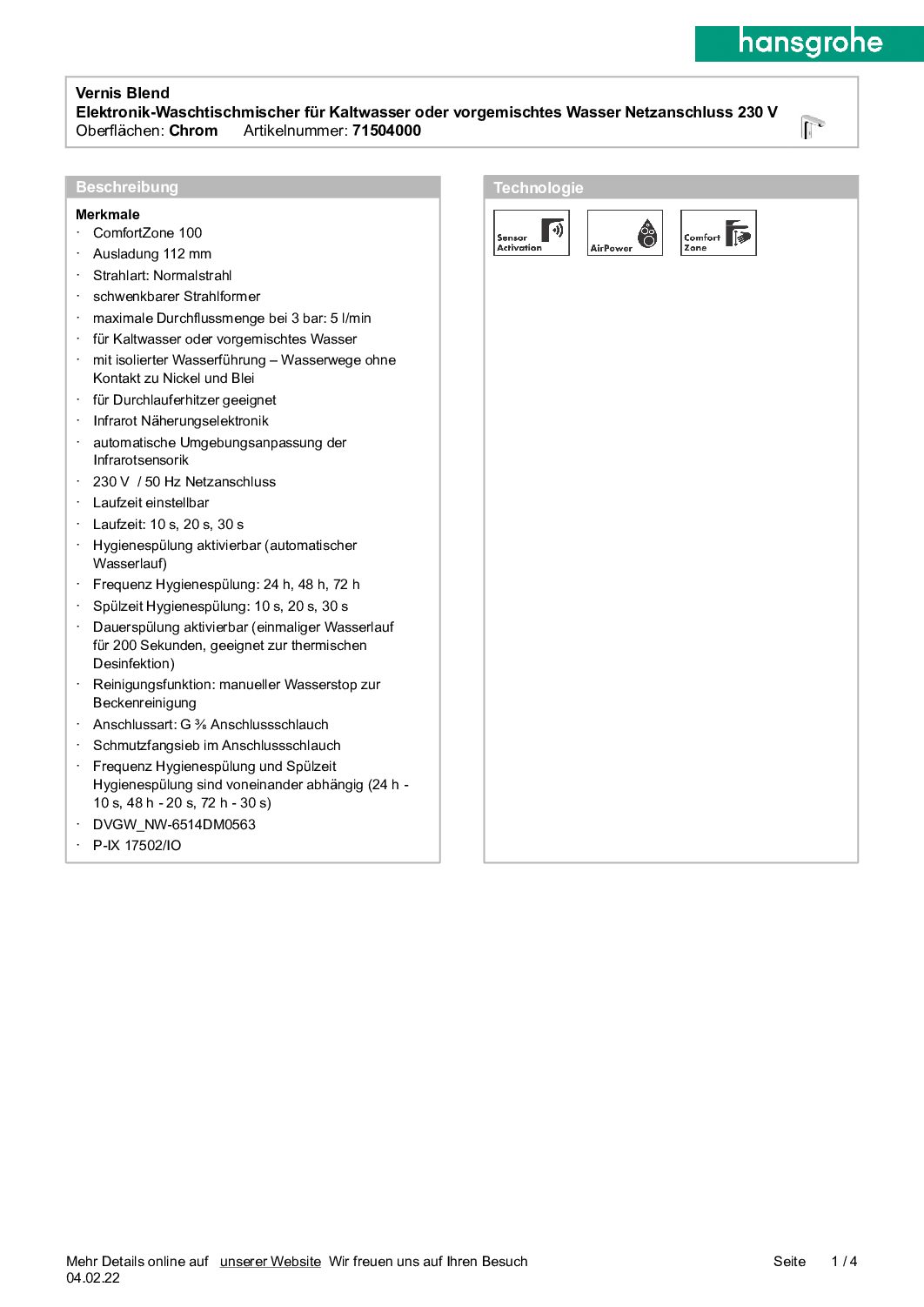 Sensor-Armatur Hansgrohe Vernis Blend Netzbetrieb Temperaturvoreinstellung chrom