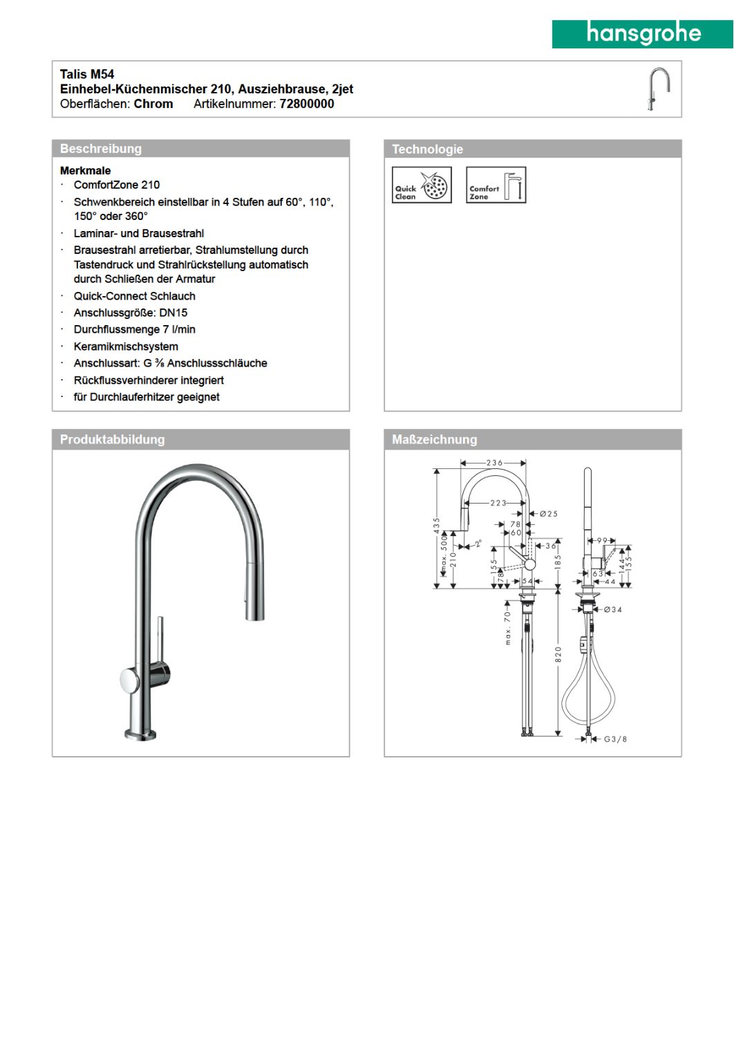 Spültischmischer Hansgrohe 210 Talis M54 herausziehbare Geschirrbrause Ausladung 223 mm chrom