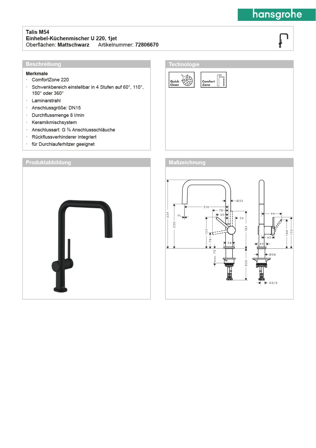 Spültischmischer Hansgrohe 210 Vernis Blend M35 Schwenkauslauf Ausladung 221 mm mattschwarz