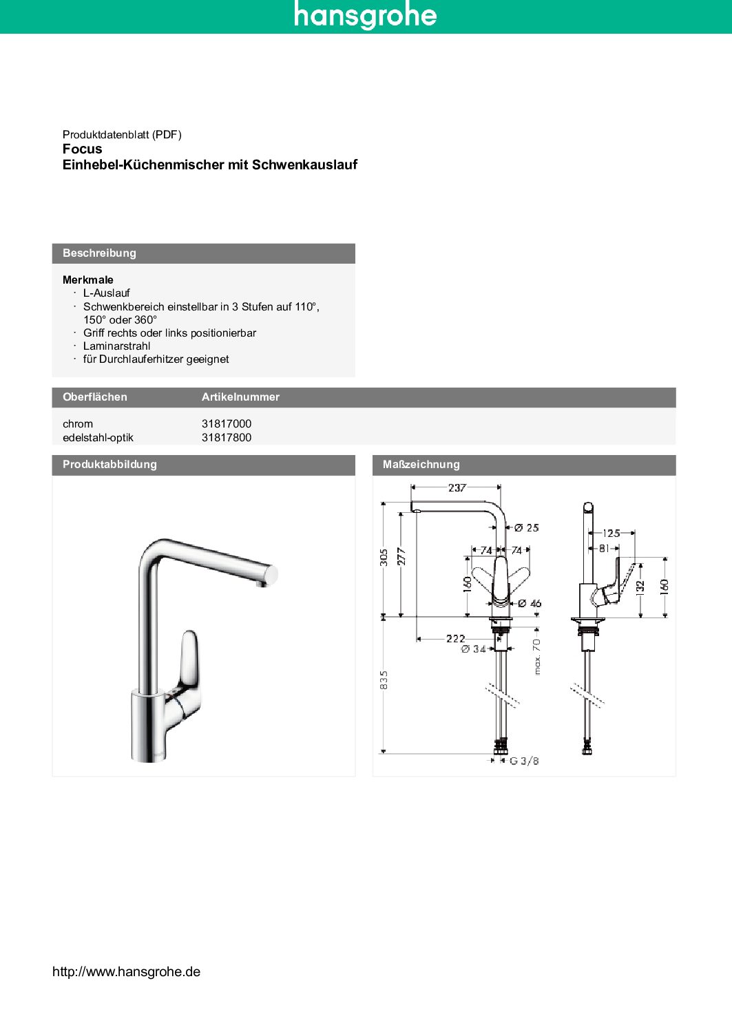 Spültischmischer Hansgrohe Focus Schwenkauslauf Ausladung 220 mm verchromt