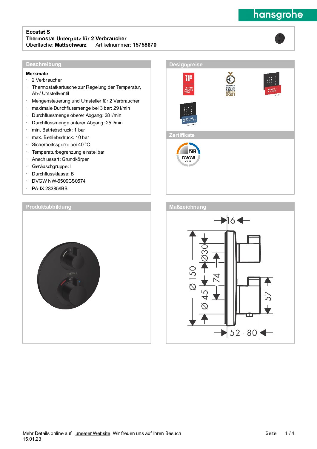 Unterputz Ecostat S Hansgrohe 2 Verbraucher mattschwarz