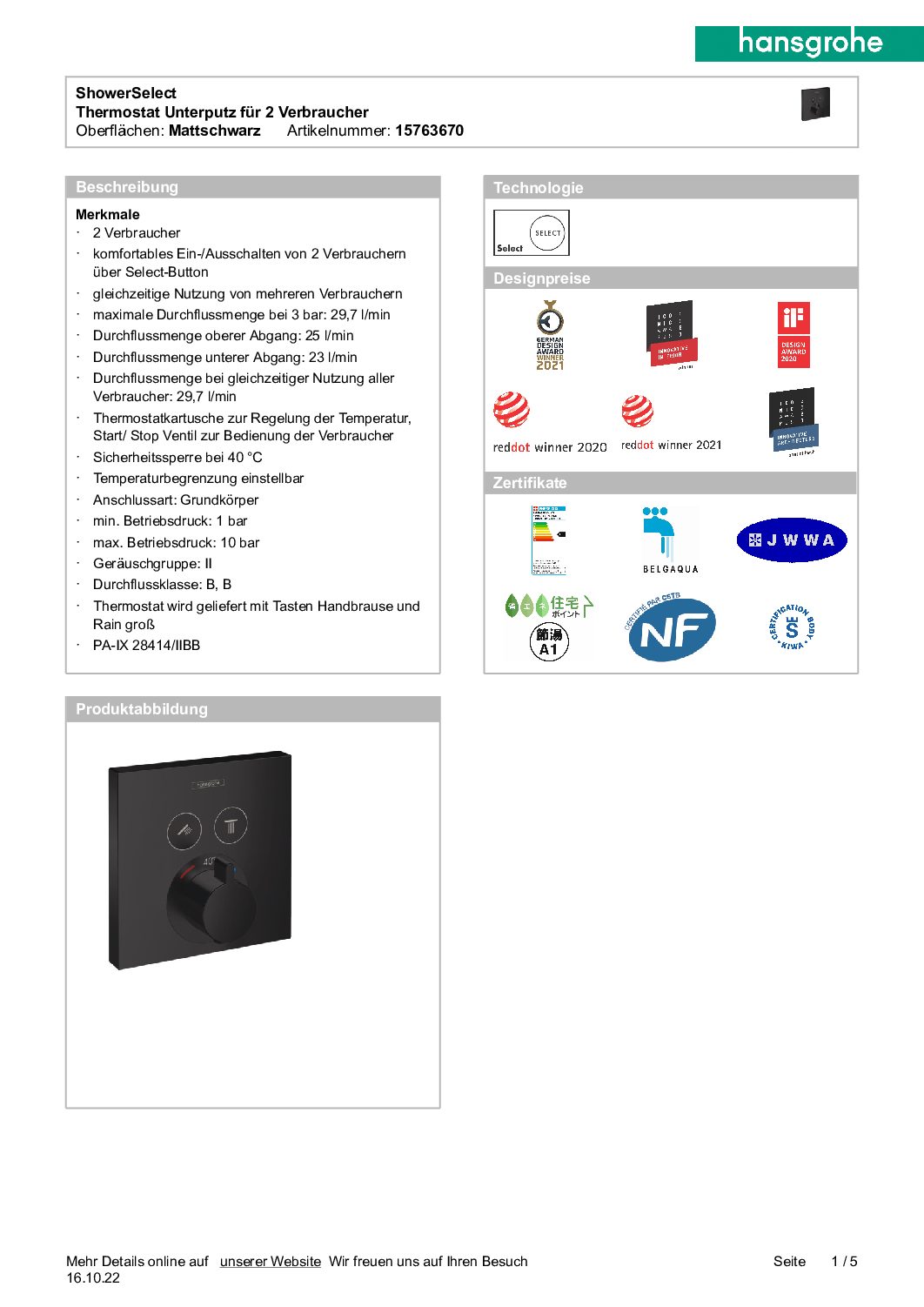 Unterputz-Thermostat Hansgrohe ShowerSelect Fertigset 2 Verbraucher mattschwarz