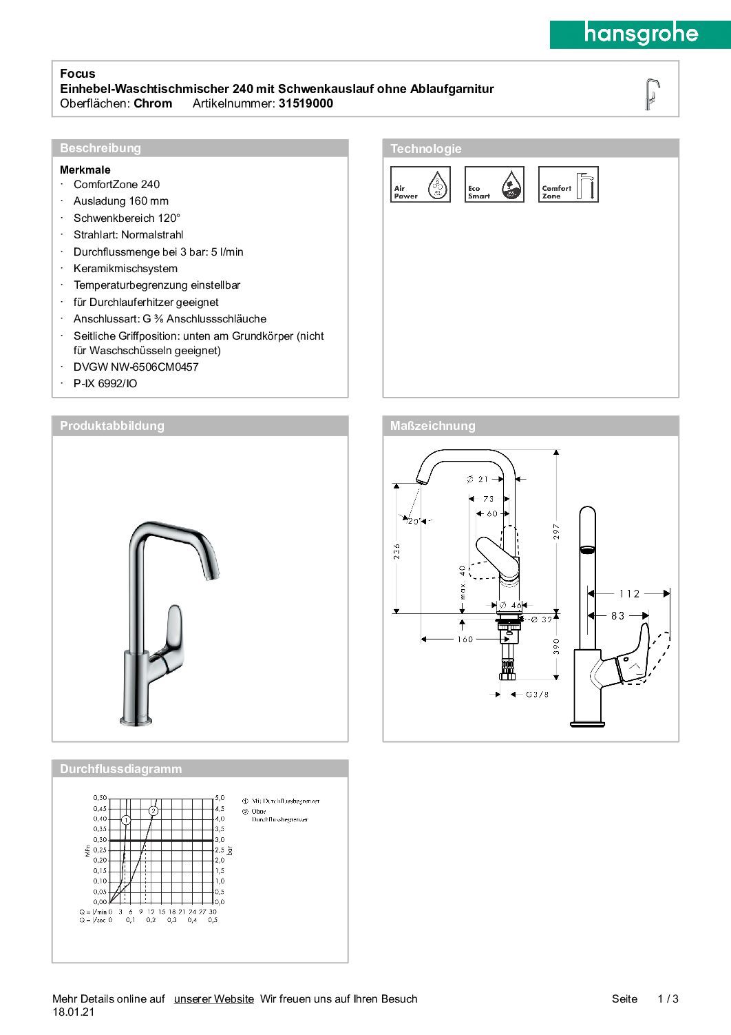 Waschtischmischer Hansgrohe 100 Focus Eco C3 Ausladung 119 mm chrom