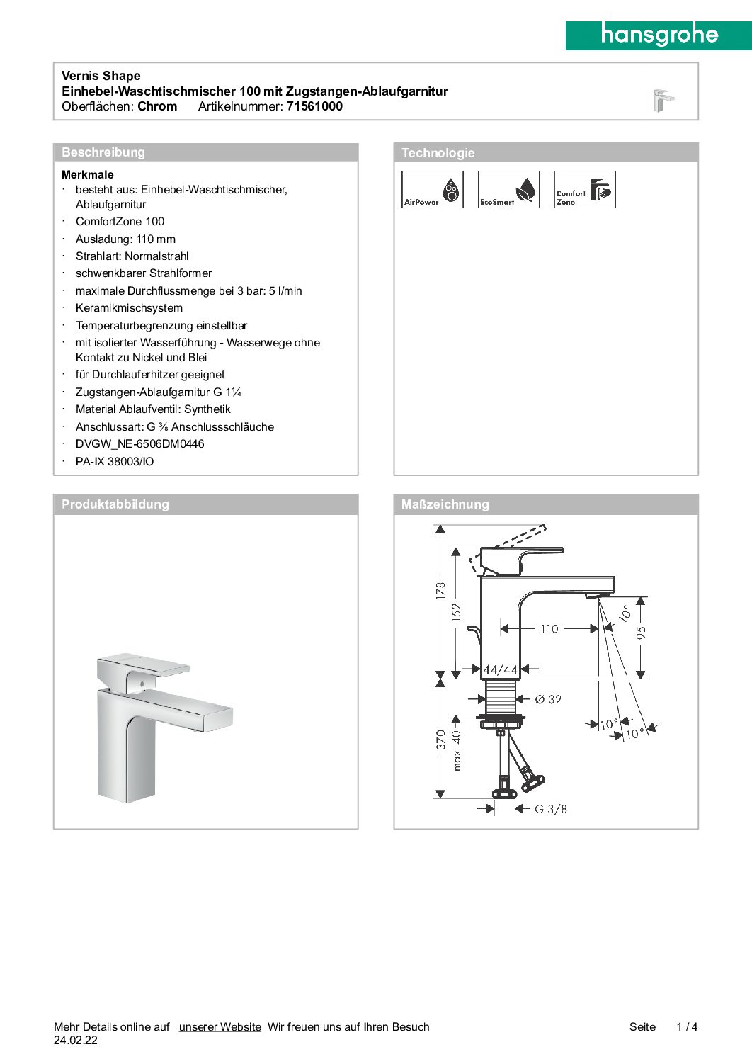 Waschtischmischer Hansgrohe 100 Vernis Shape Ausladung 110 mm chrom mit Zugstangen-Ablaufgarnitur