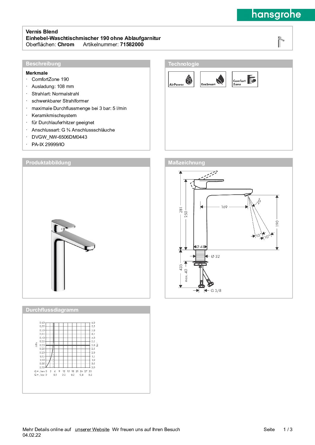 Waschtischmischer Hansgrohe 190 Vernis Blend Ausladung 169 mm chrom ohne Ablaufgarnitur