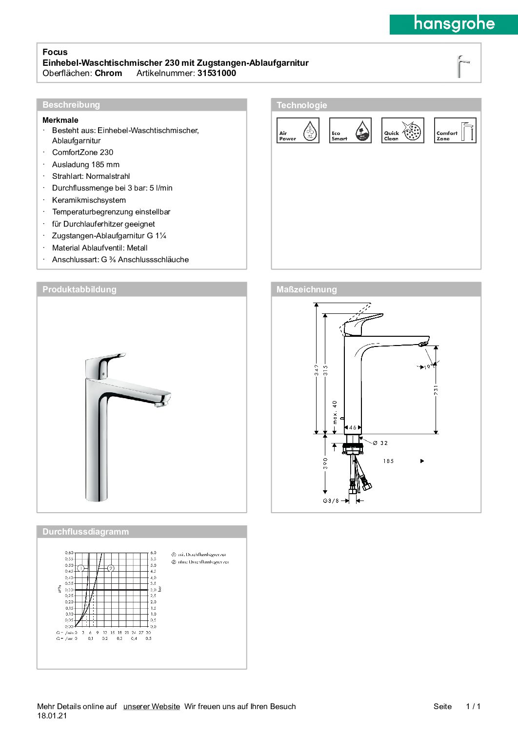 Waschtischmischer Hansgrohe 230 Focus Ausladung 185 mm chrom