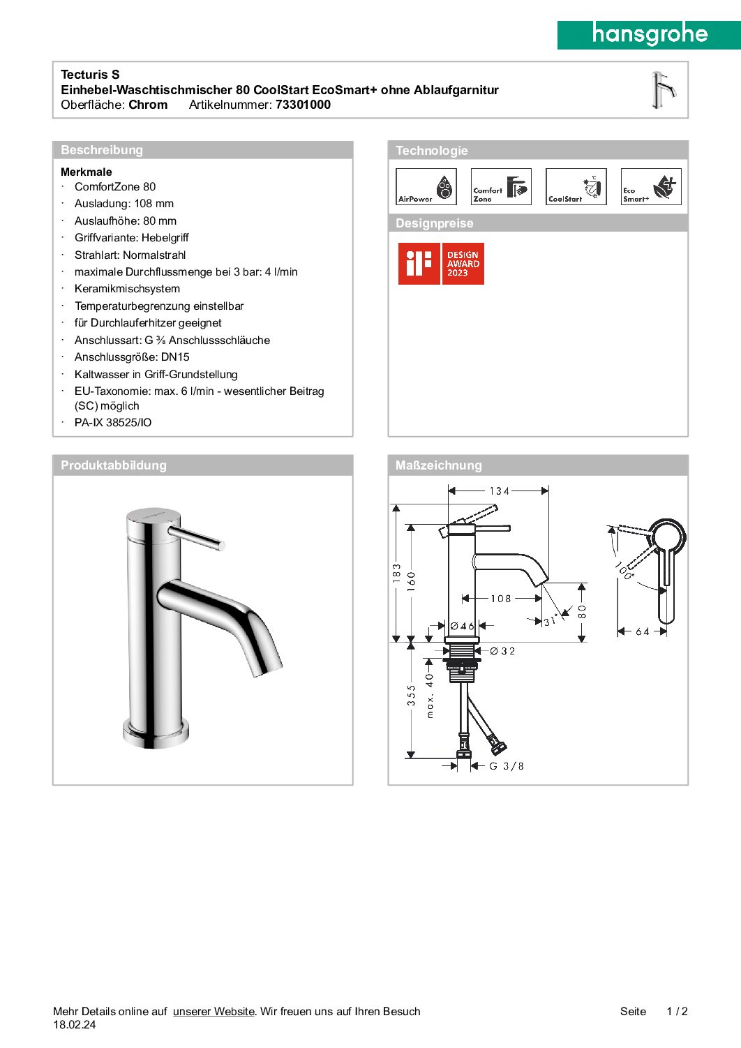 Waschtischmischer Hansgrohe 80 Tecturis S Ausladung 108 mm CoolStart ohne Ablaufgarnitur chrom