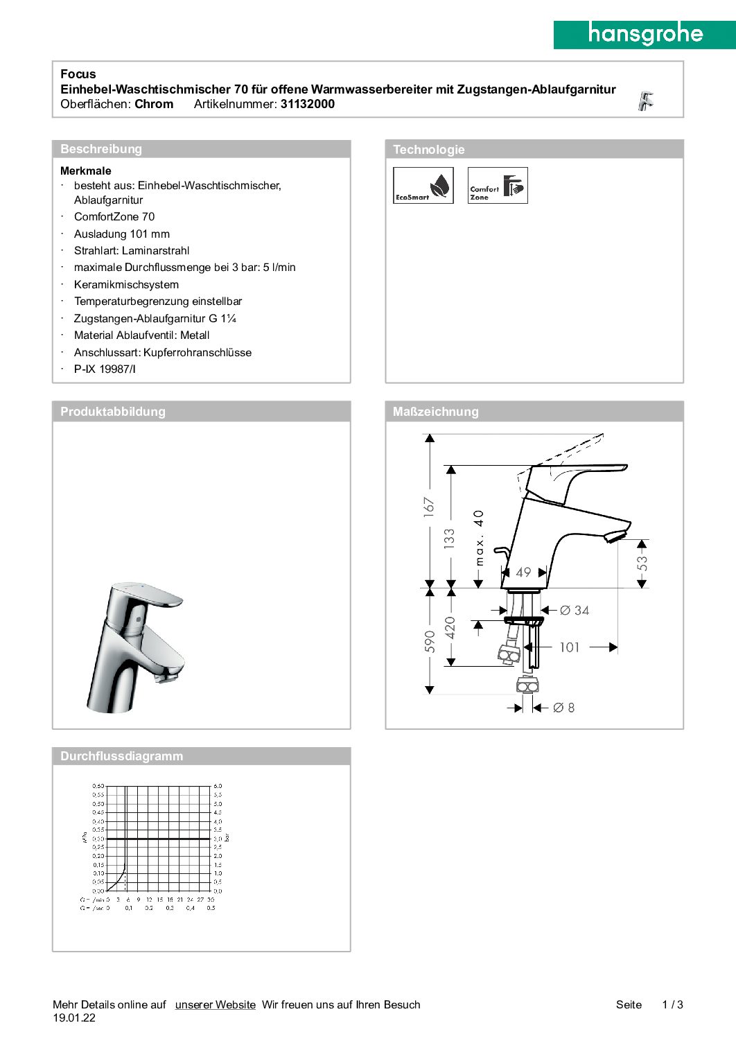 Waschtischmischer Hansgrohe Focus 70 ND Ausladung 101 mm chrom