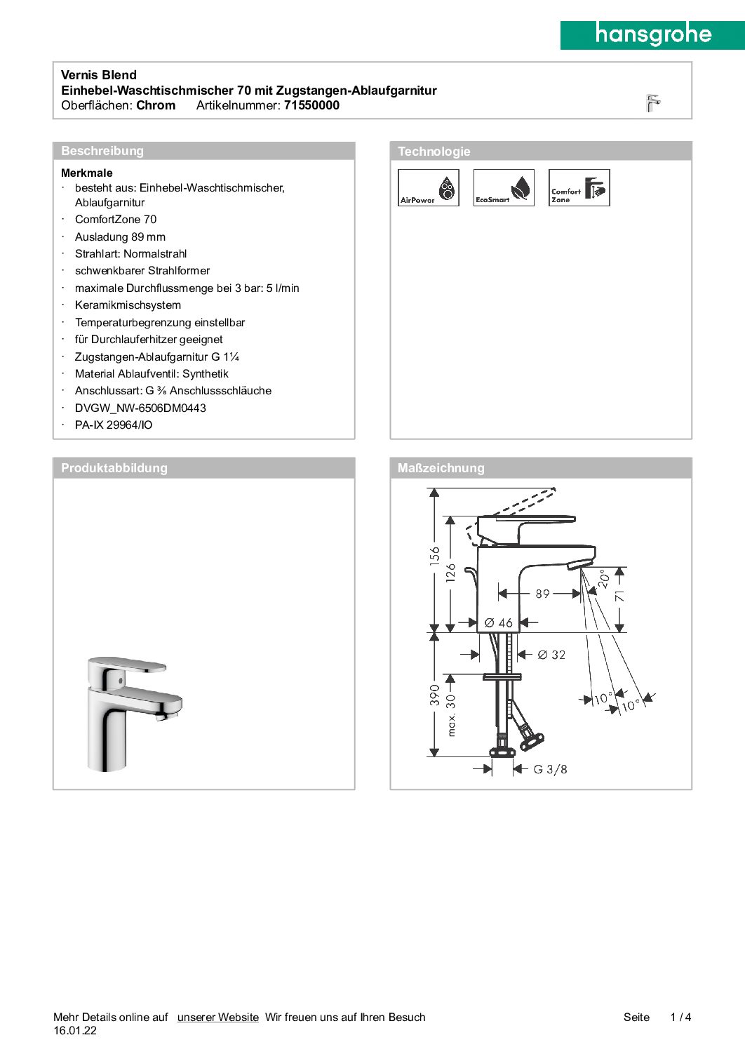 Waschtischmischer Hansgrohe 70 Vernis Blend Ausladung 89 mm chrom