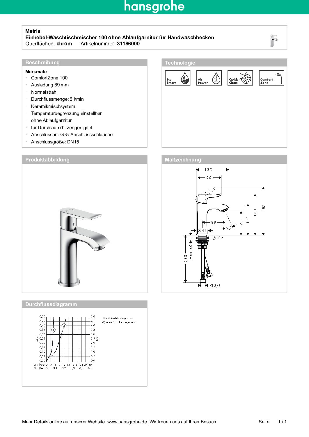 Waschtischmischer Hansgrohe Metris 100 Ausladung 89 mm chrom ohne Ablaufgarnitur