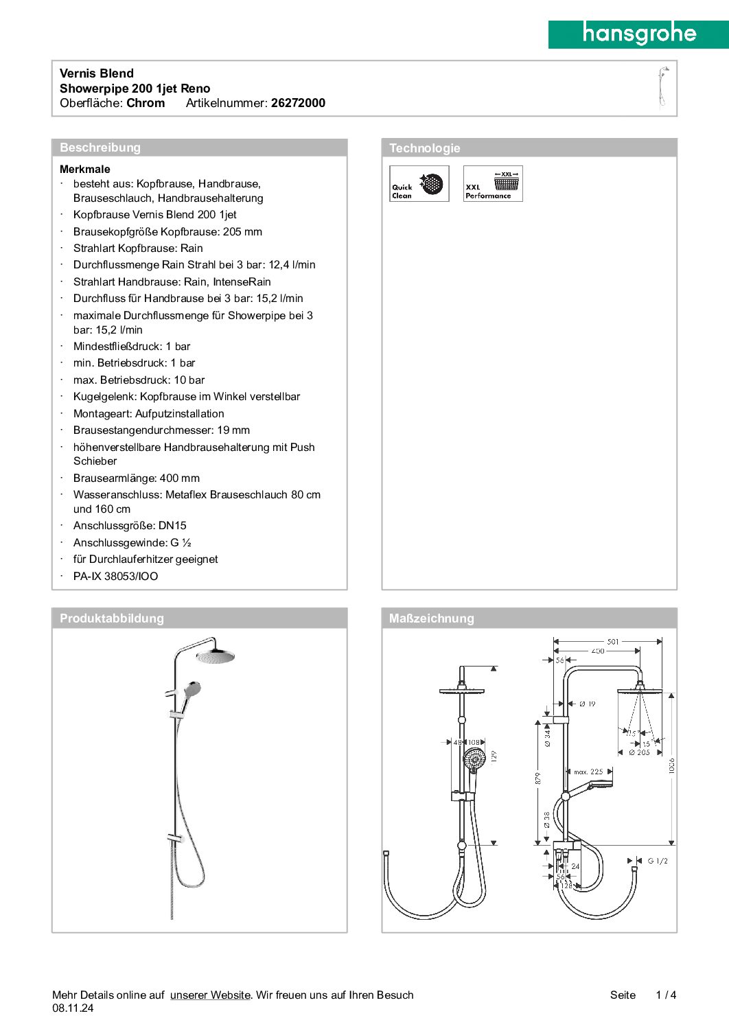 Brause-System Hansgrohe 200 Vernis Blend Reno Handbrause + Kopfbrause Ø 205 mm chrom