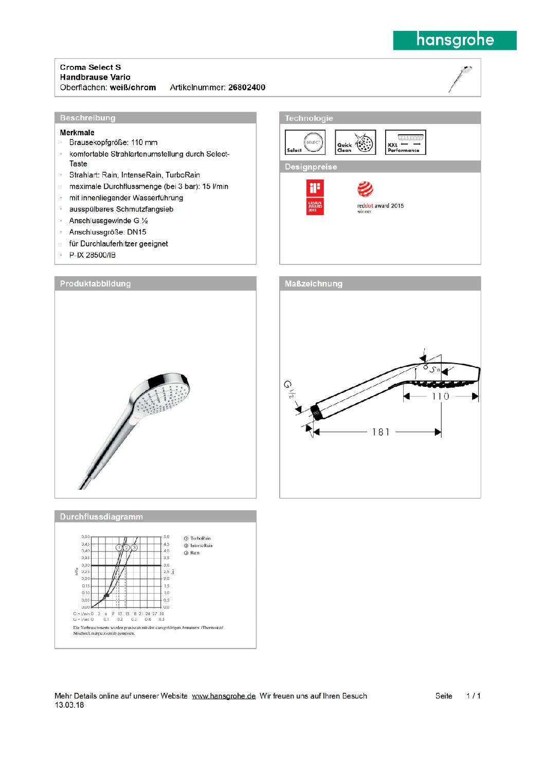Handbrause Hansgrohe Croma Select E Vario 3 Strahlarten Ø 110 mm weiss/chrom
