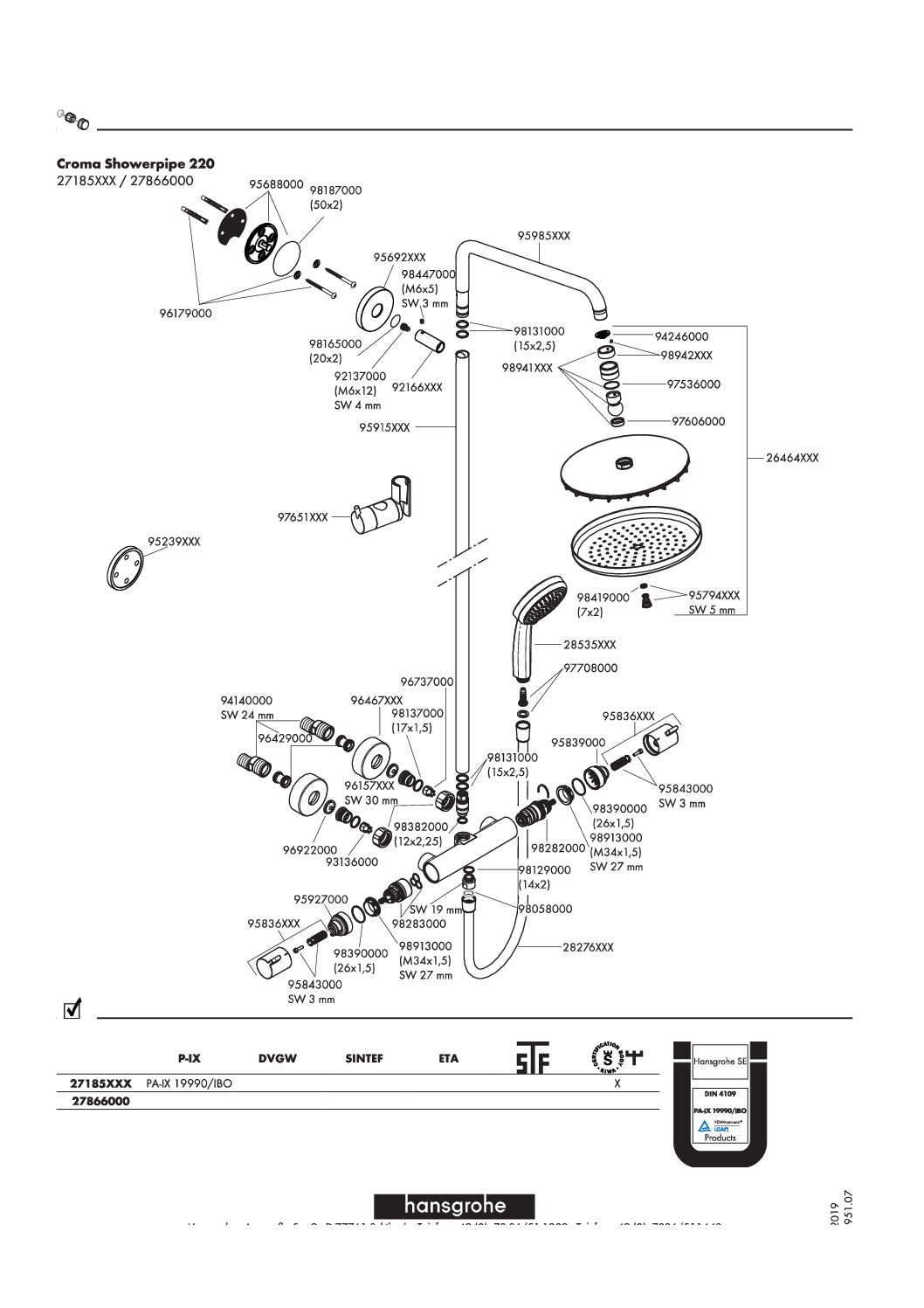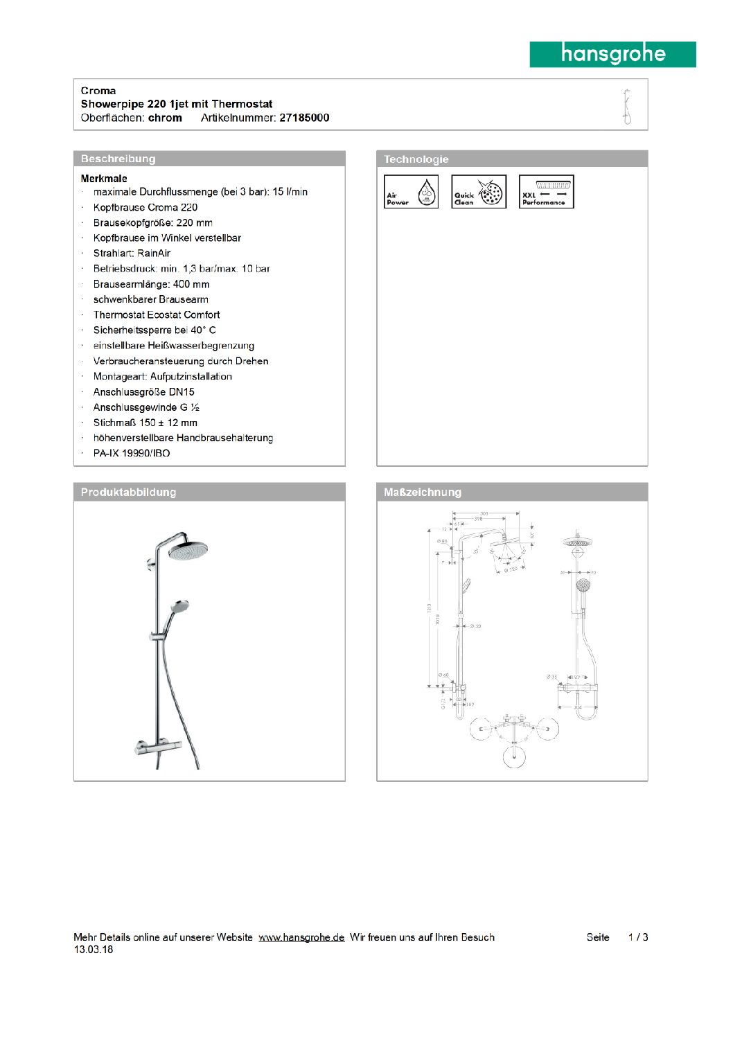 Brause-System Hansgrohe Croma 220 Handbrause, Kopfbrause Ø 220 mm und Thermostat chrom