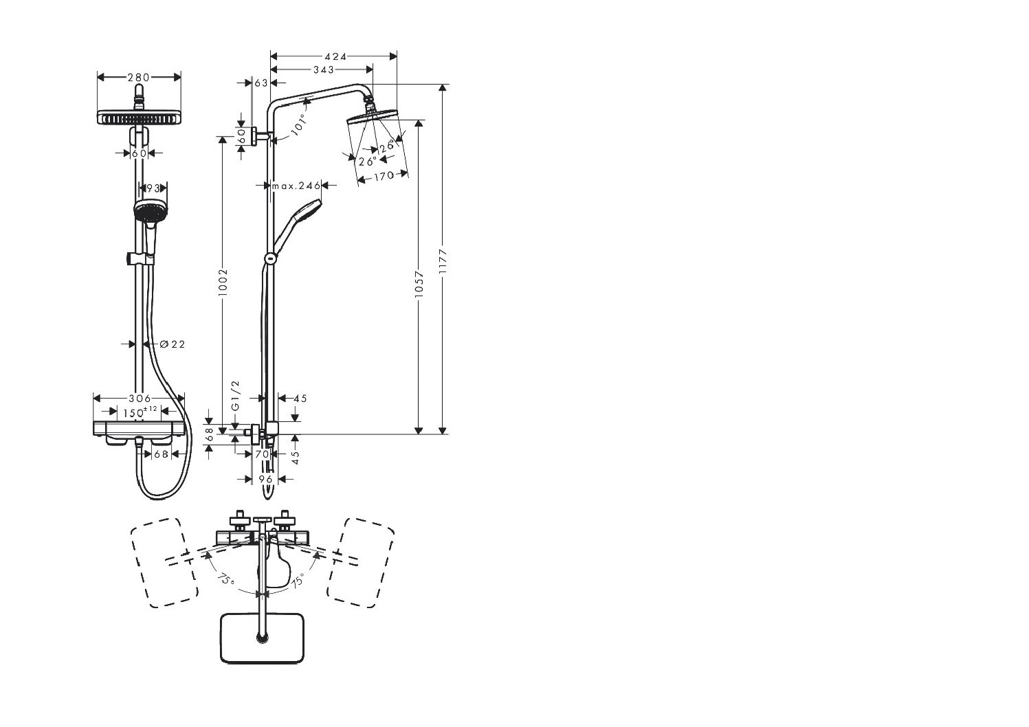 – Brausearm: 343 mm, 150° schwenkbar