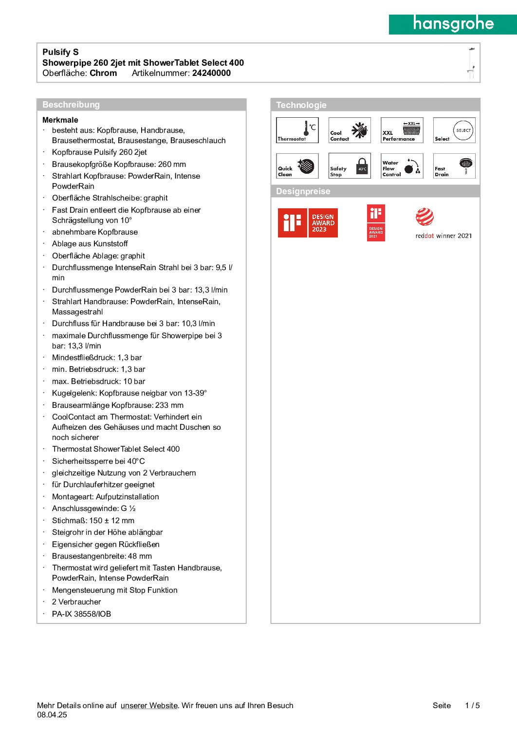– Kopfbrause: Pulsify 260 2jet, ø 260 mm, 2 Strahlarten (PowderRain, Intense PowderRain), Drehwinkel +/- 15°