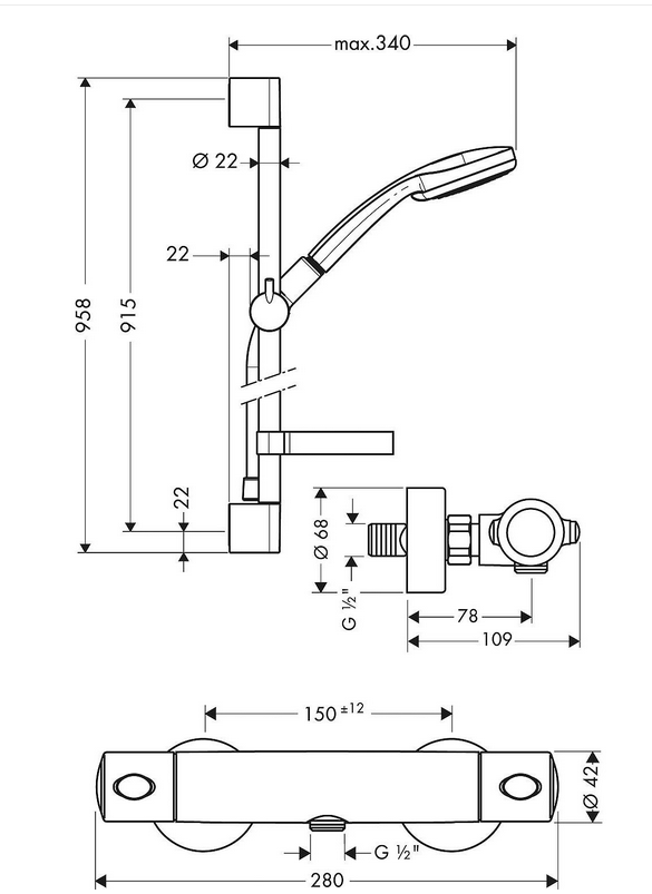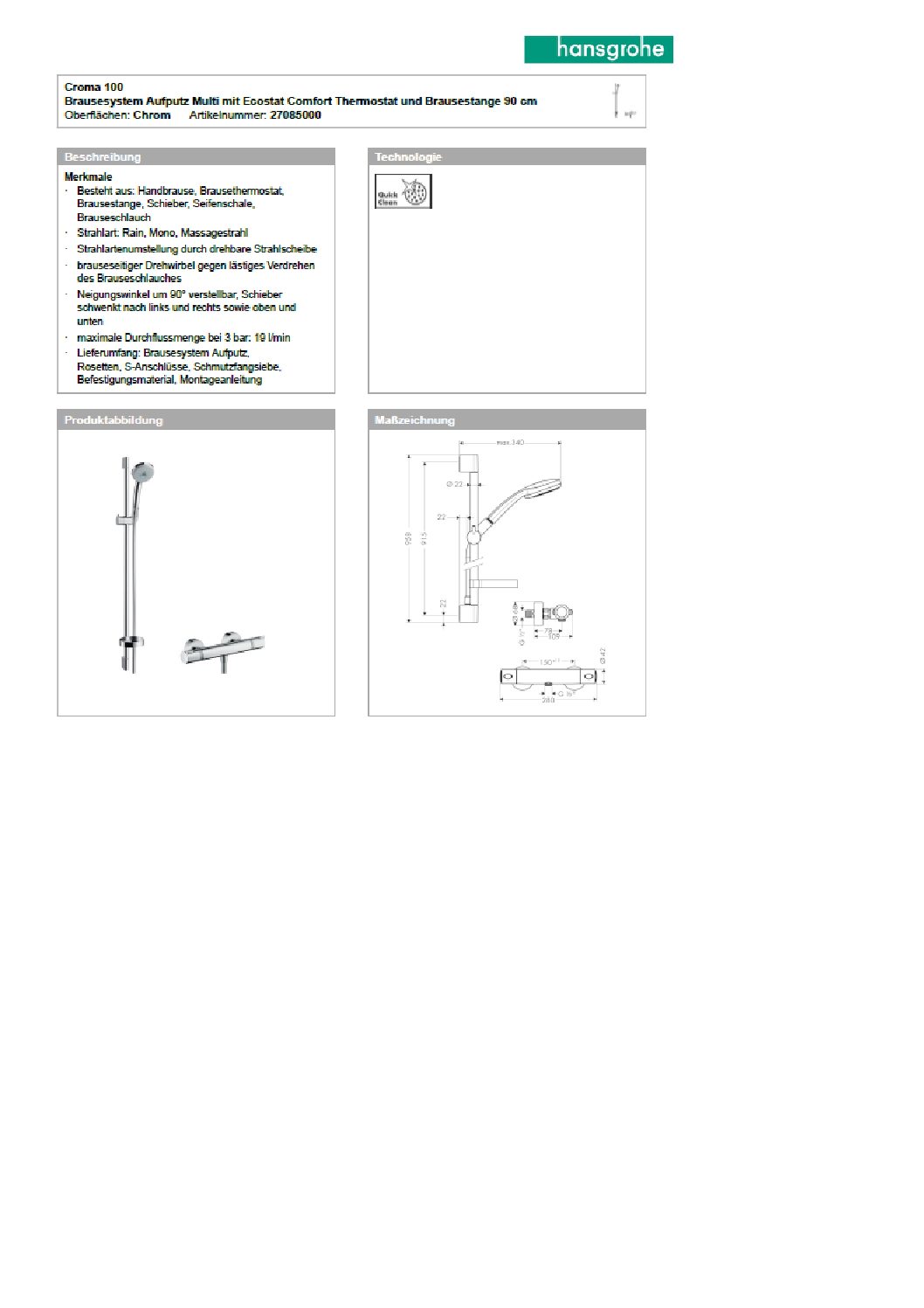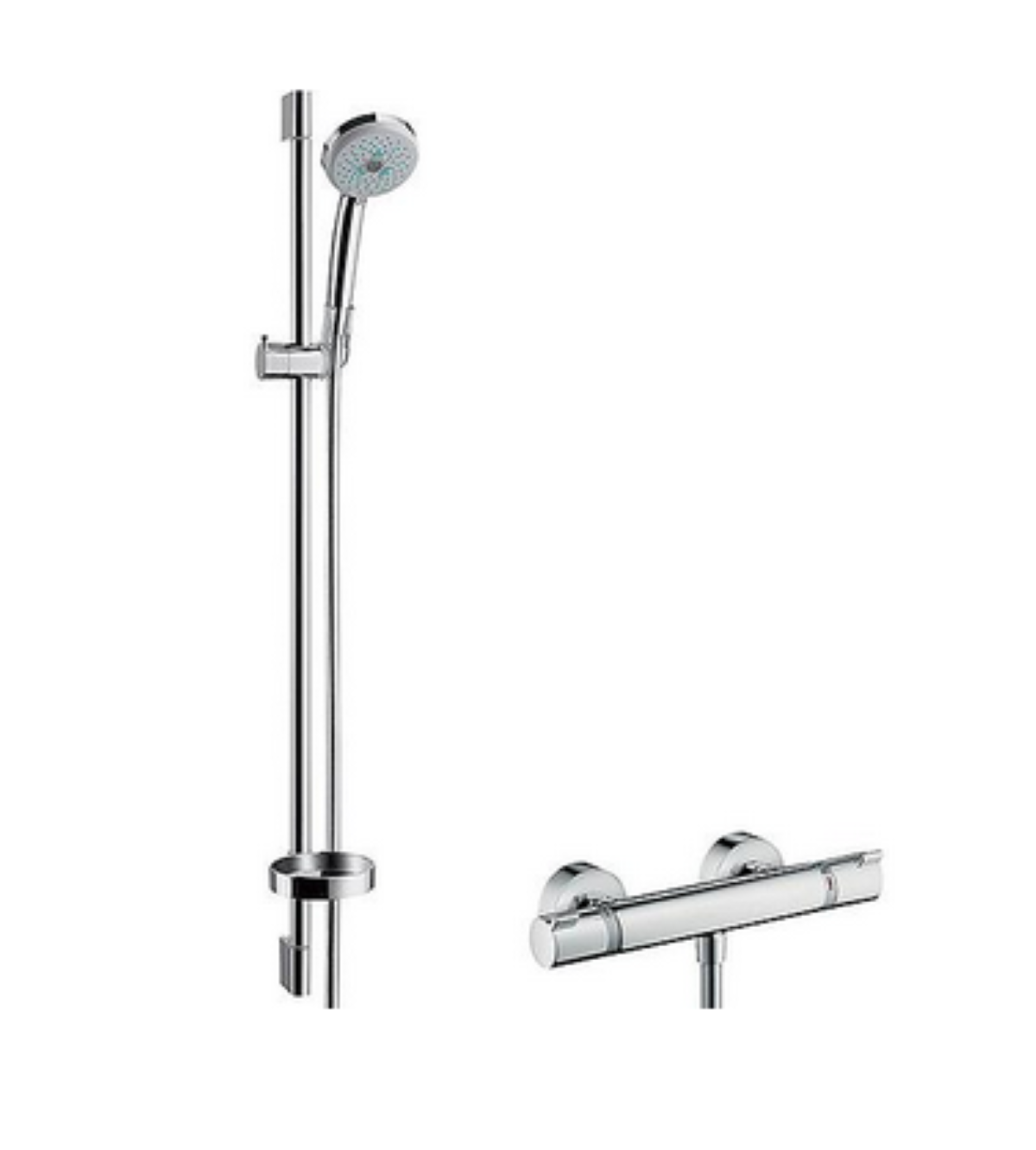 Brausethermostat-Set Hansgrohe Croma 100 Brausestange 900 mm, Handbrause Ø 100 mm und Brauseschlauch chrom