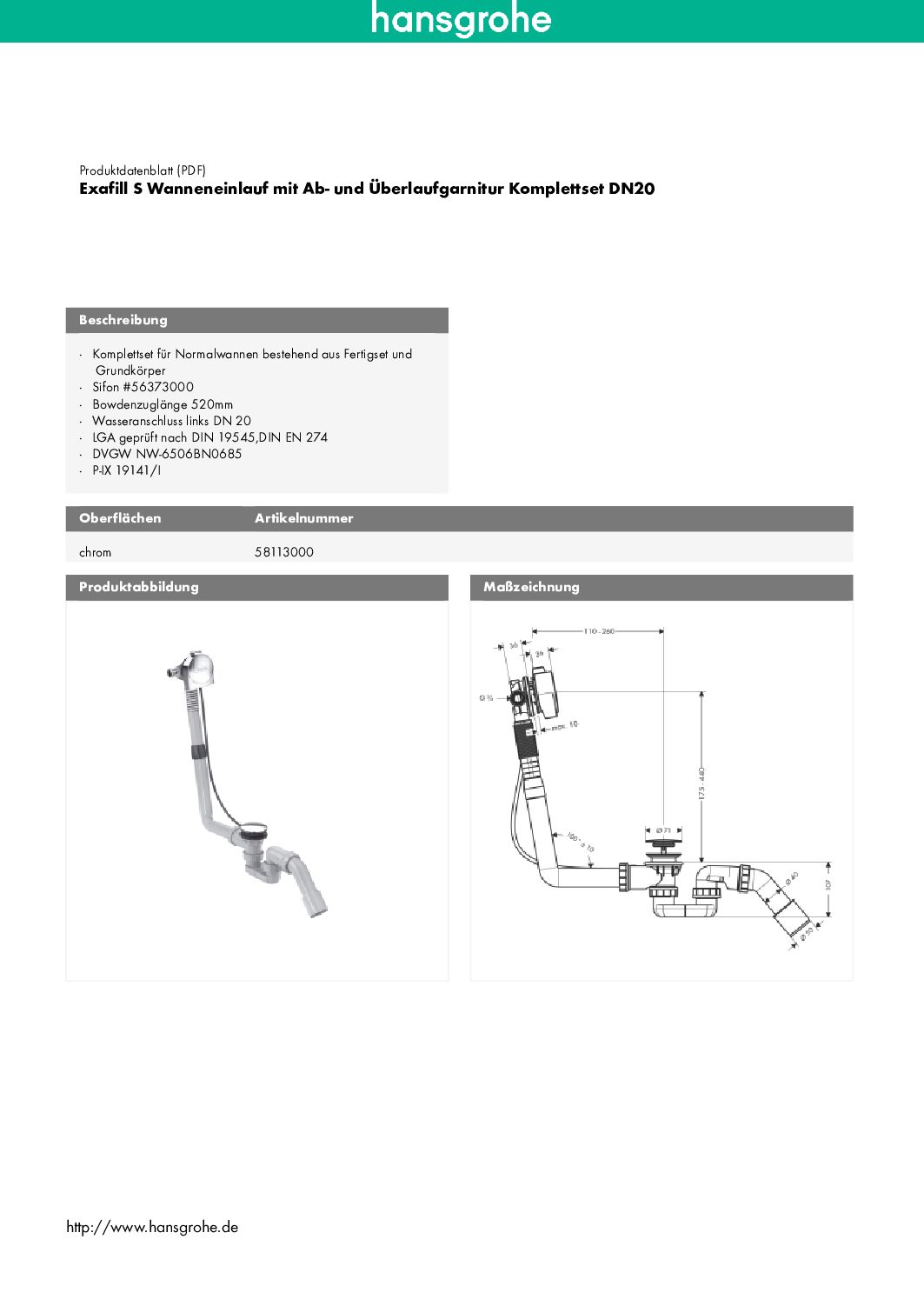 Exafill S Wanneneinlauf mit Ab- und Überlaufgarnitur Komplettset DN20, für Normalwannen – chrom