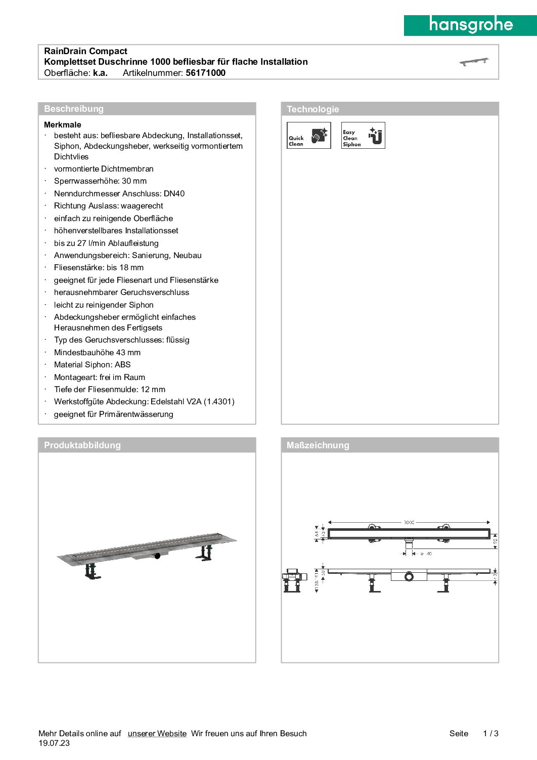 Schlagwörter: 1000, befliesbar, Hansgrohe RainDrain Compact Komplettset f. flache Installation