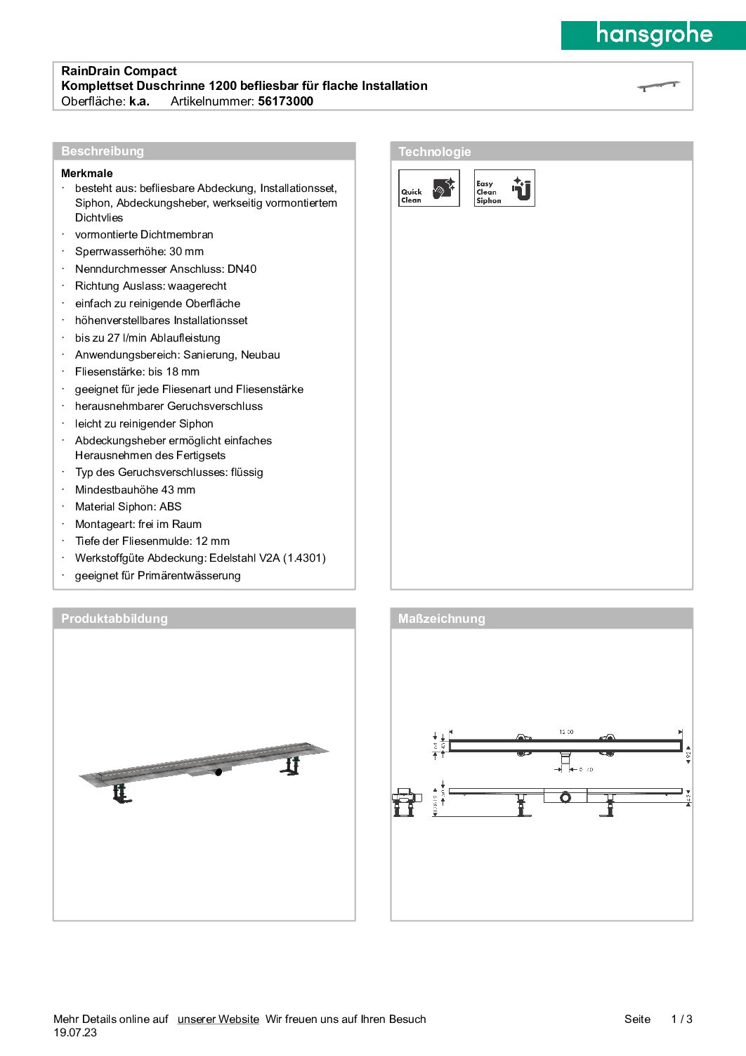 Schlagwörter: 1200, befliesbar, Hansgrohe RainDrain Compact Komplettset f. flache Installation