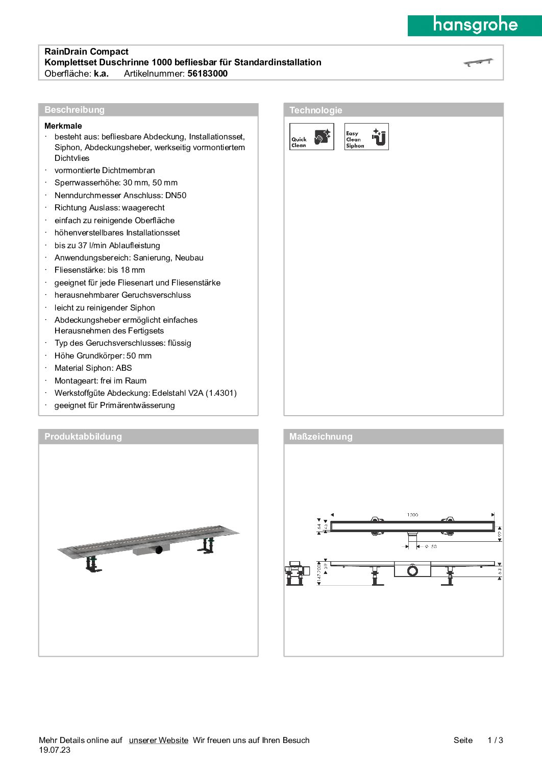 Hansgrohe RainDrain Compact Komplettset f. Standardinstallation, befliesbar, 1000