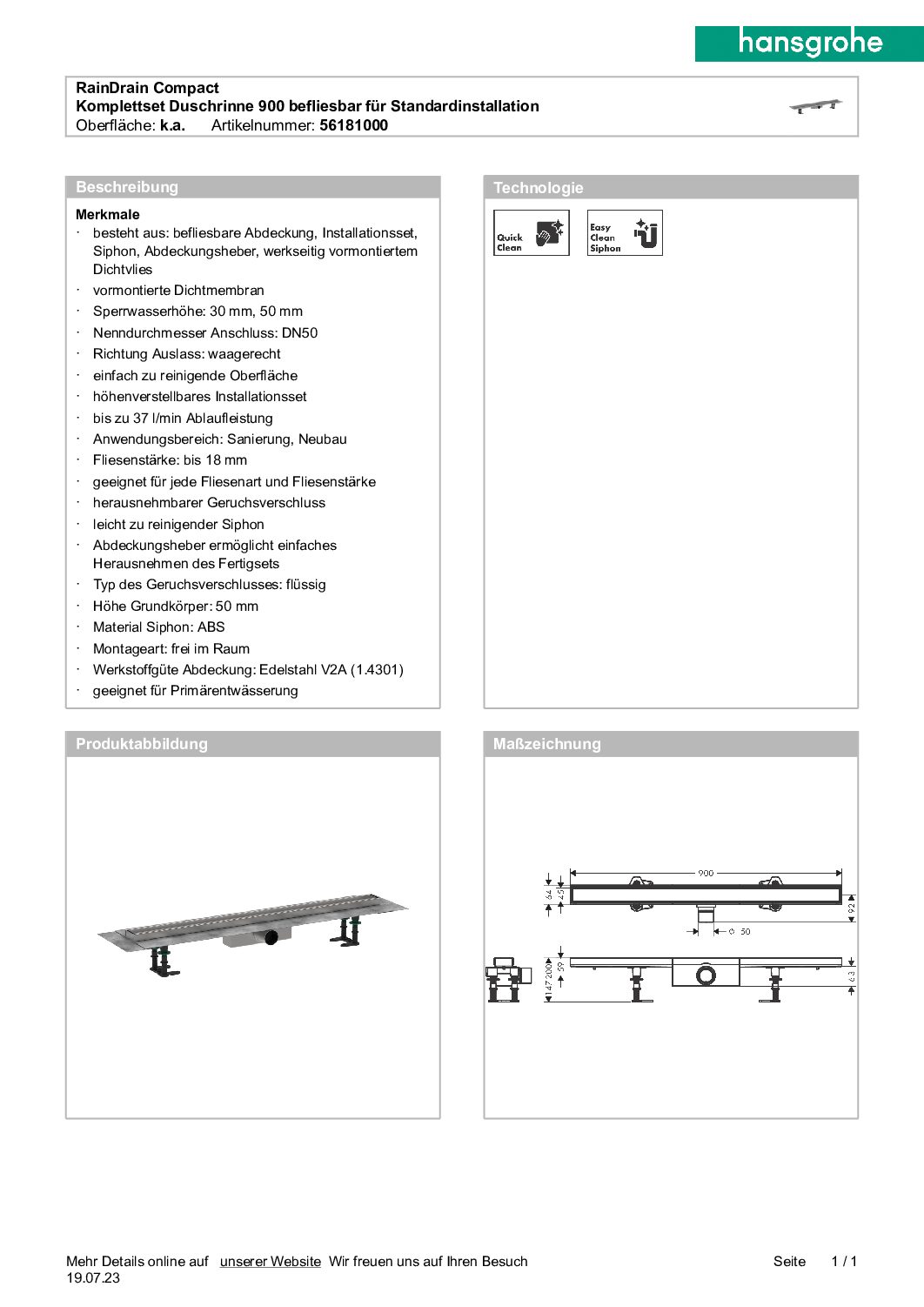 Hansgrohe RainDrain Compact Komplettset f. Standardinstallation, befliesbar, 900