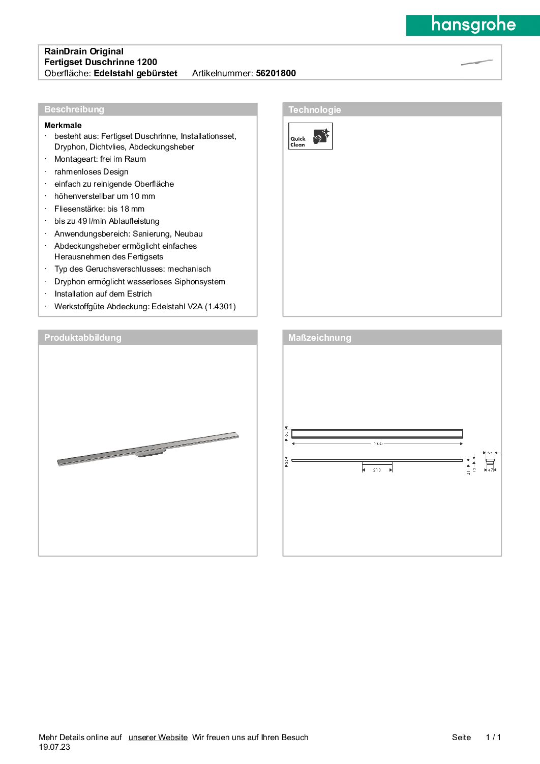 Hansgrohe RainDrain Original Fertigset Duschrinne 1200
