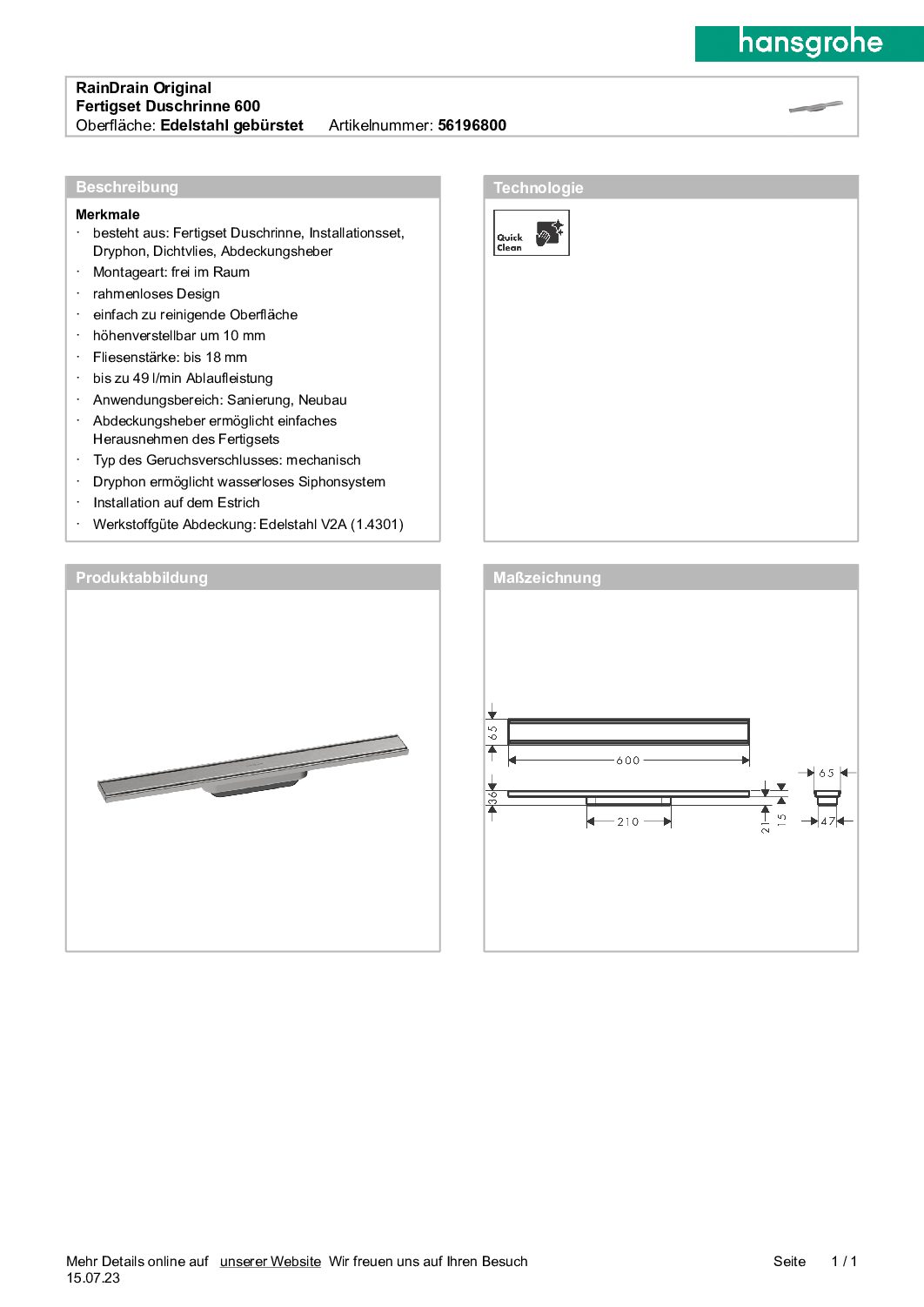 Hansgrohe RainDrain Original Fertigset Duschrinne 600