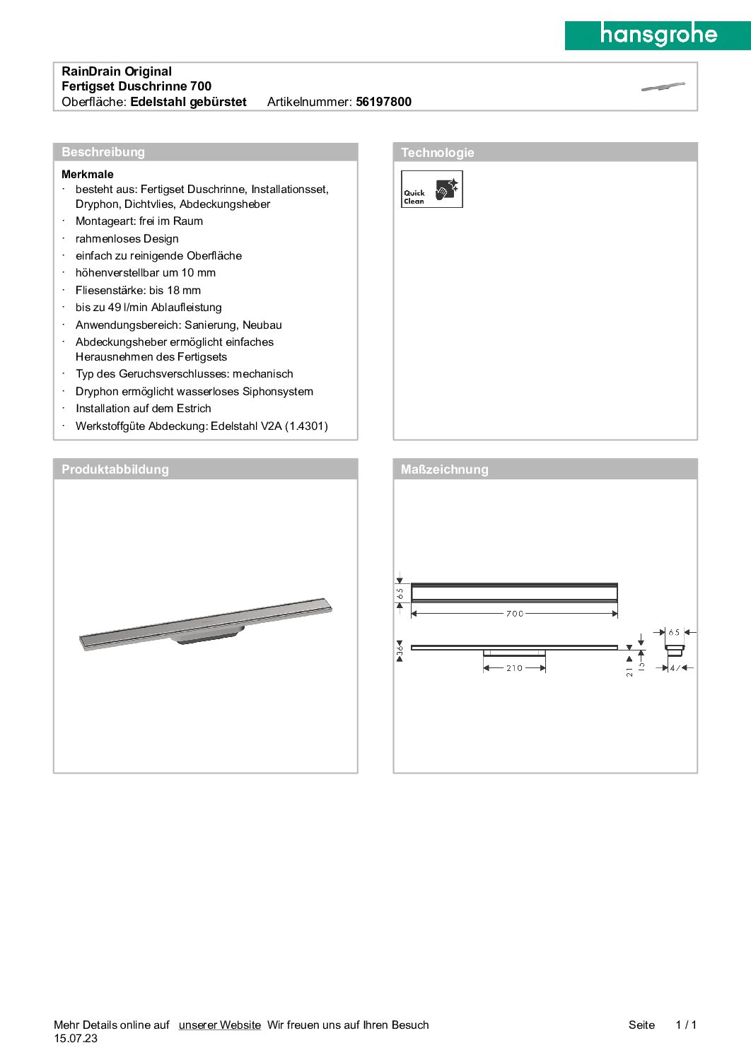 Hansgrohe RainDrain Original Fertigset Duschrinne 700