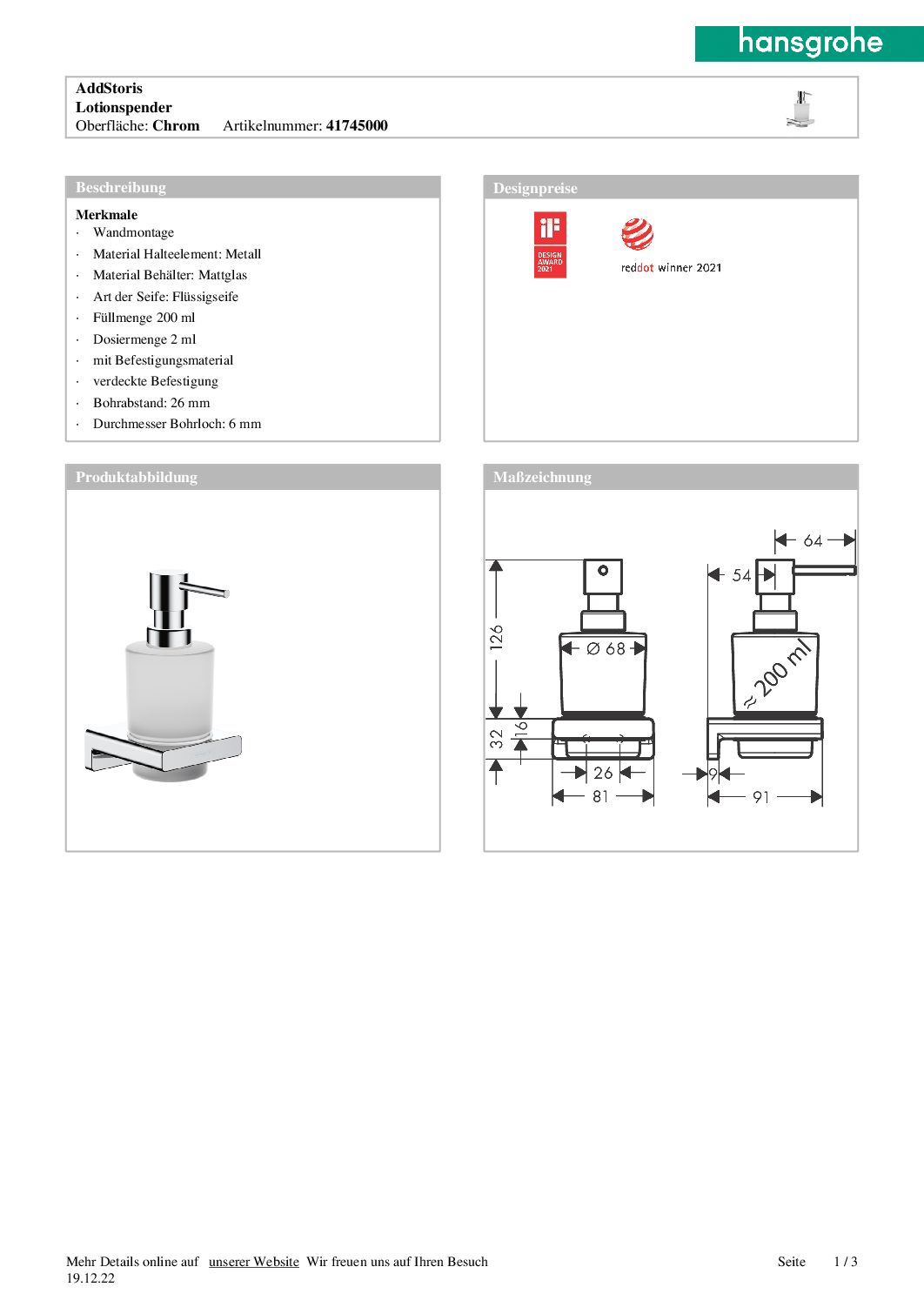 – Wandhalter und Pumpkopf: Verchromt - Füllinhalt: 200 ml