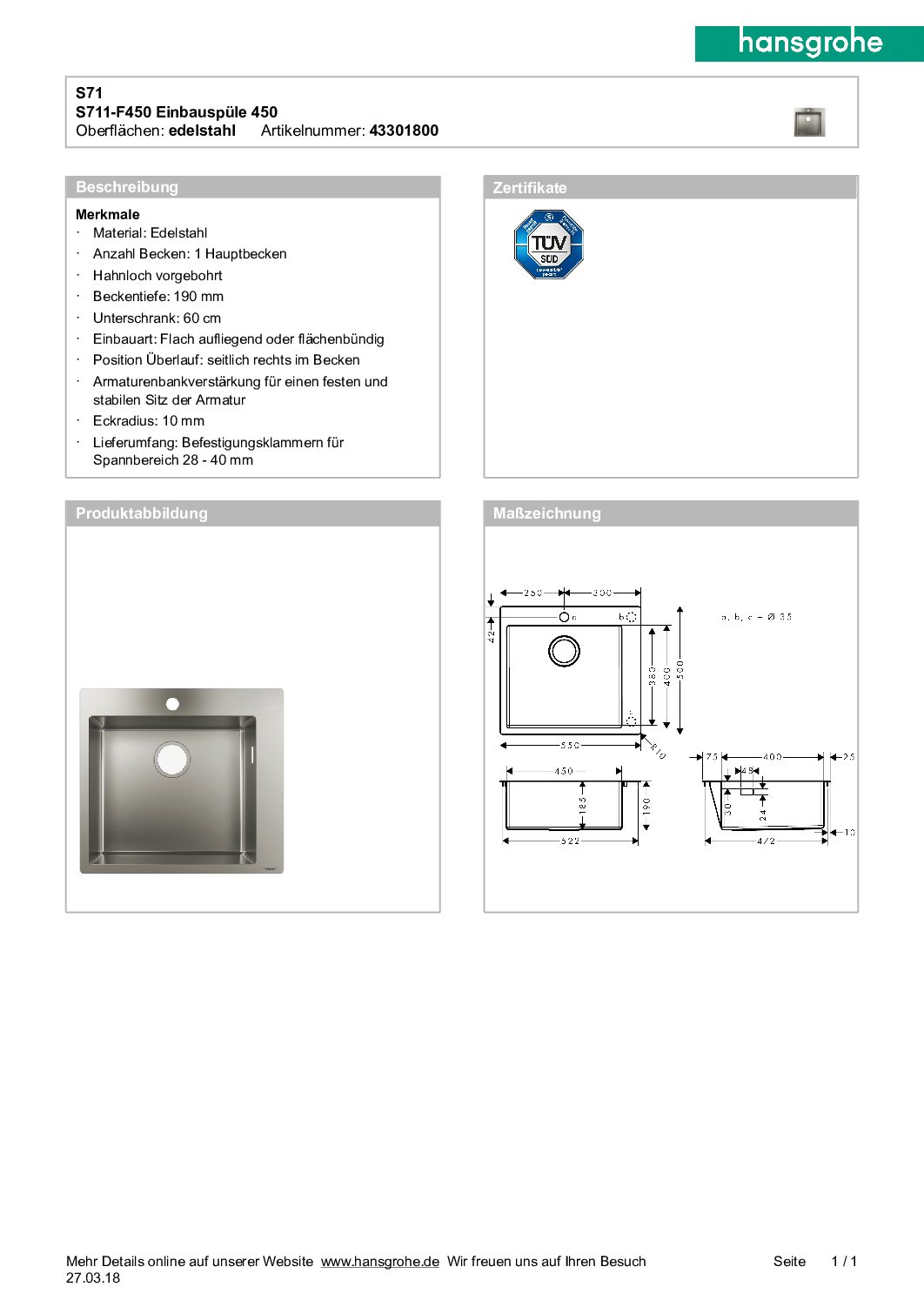 Einbauspüle Hansgrohe 450 S711-F450 Becken BxT: 450×400 mm ohne Exzenterbohrung